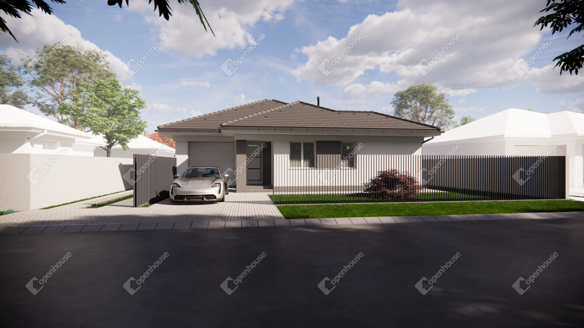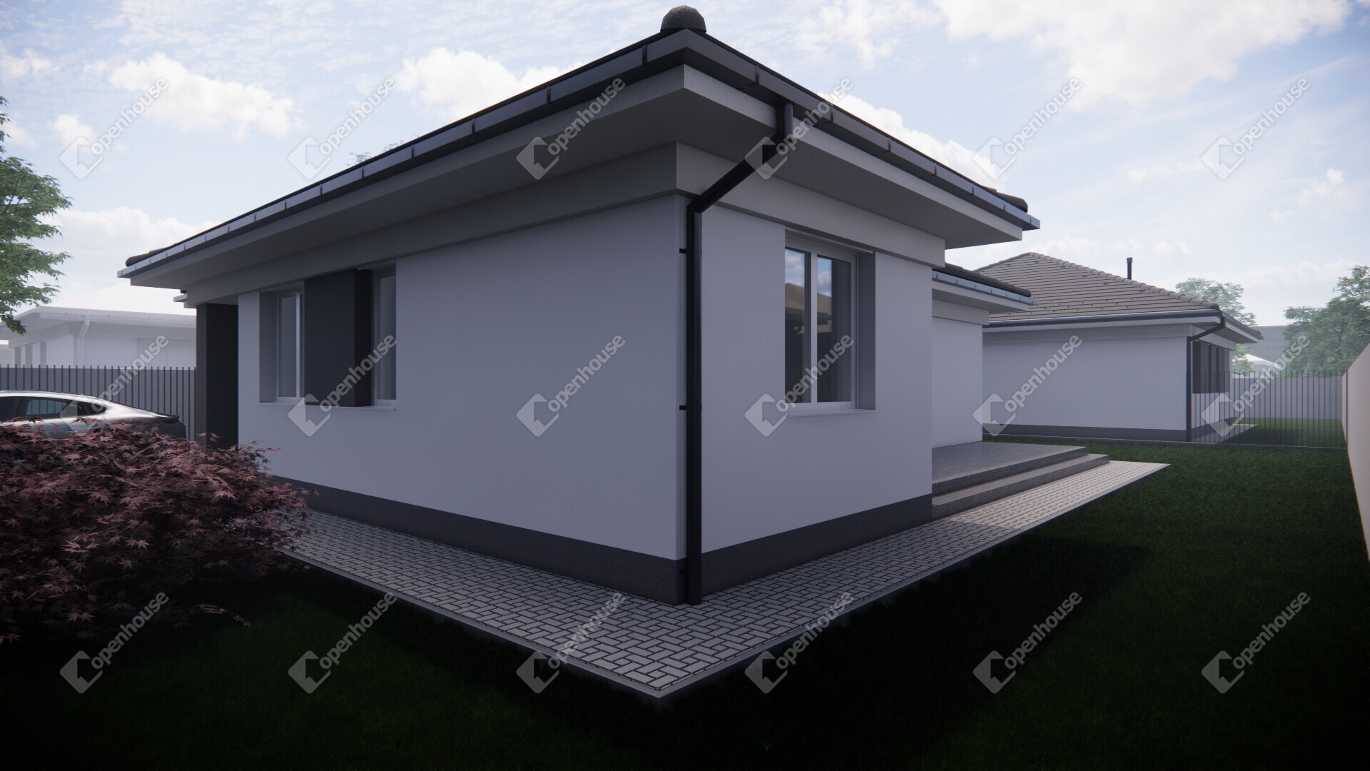 - A gépkocsik számára térkövezett bejárón lehet megközelíteni a zárt garázst, amely közvetlenül kapcsolódik a házhoz.