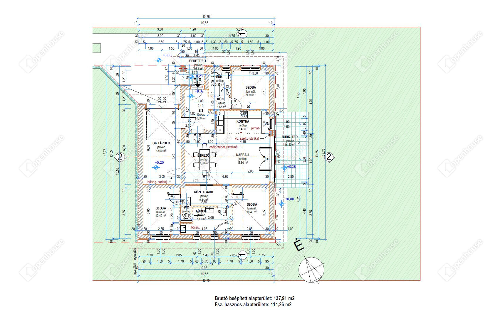 - A ház külső szerkezete modern, új építésű, 111 négyzetméteres alapterülettel és szeglemezes tetőszerkezettel, beton cserép borítással.