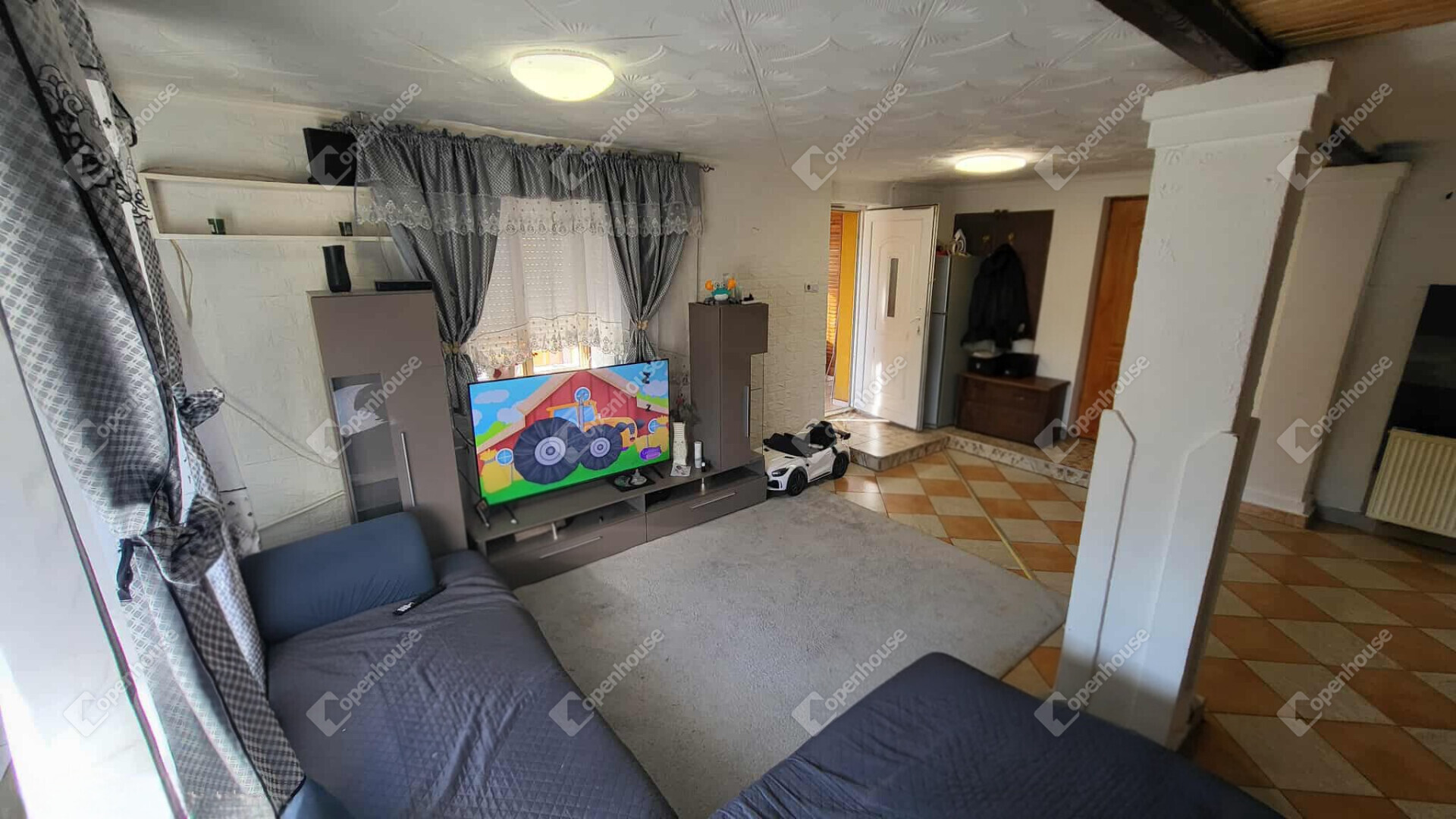 - nagy nappali, szoba, étkező, konyha, fürdő, kamra, előszoba a földszinten, az emeleten közlekedő és 2 szoba