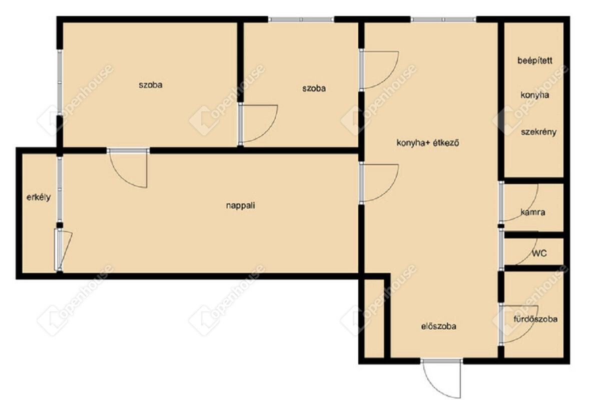 - A lakásban egy nappali, kettő szoba, étkező konyha egy légtérben, kamra, előszoba, fürdőszoba WC külön helységben található.