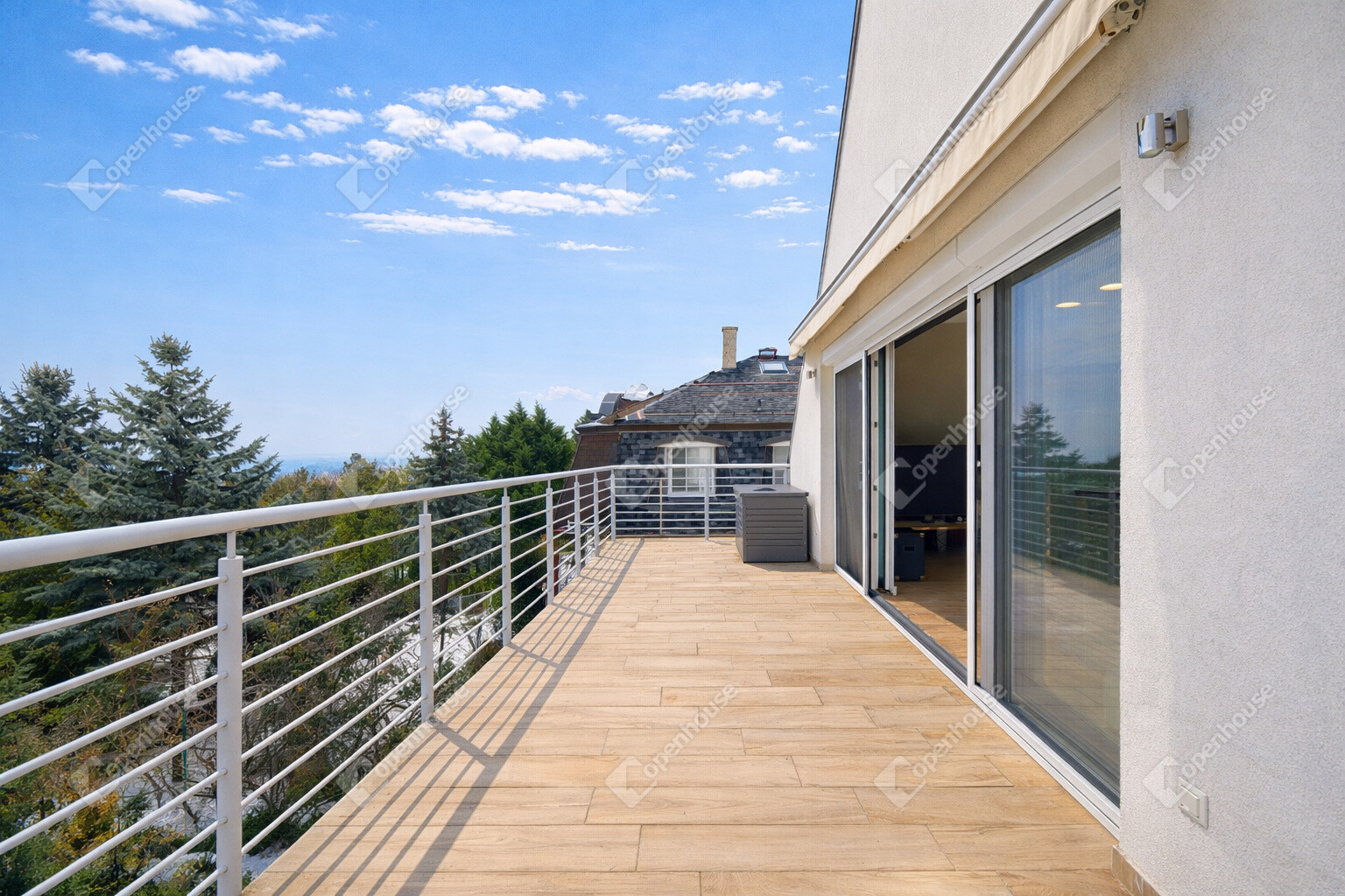 Nagyméretű panorámás főterasz, elektromos mozgatású napellenzővel