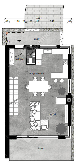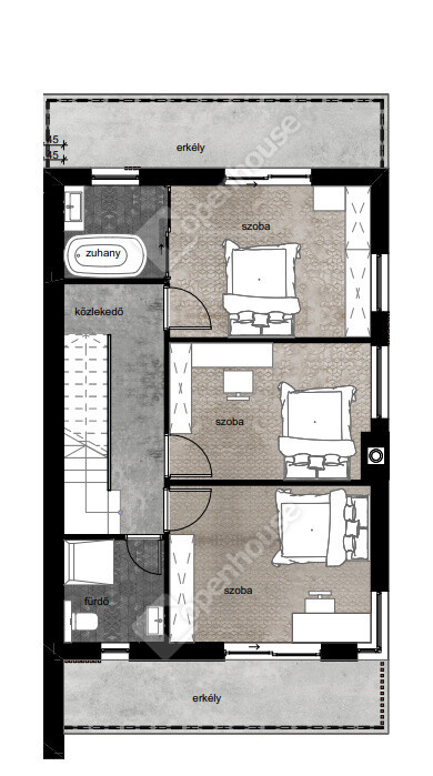 Itt a terasz 20m2 és az erkély 25m2 (míg az 1-es lakásnál fordítva van)