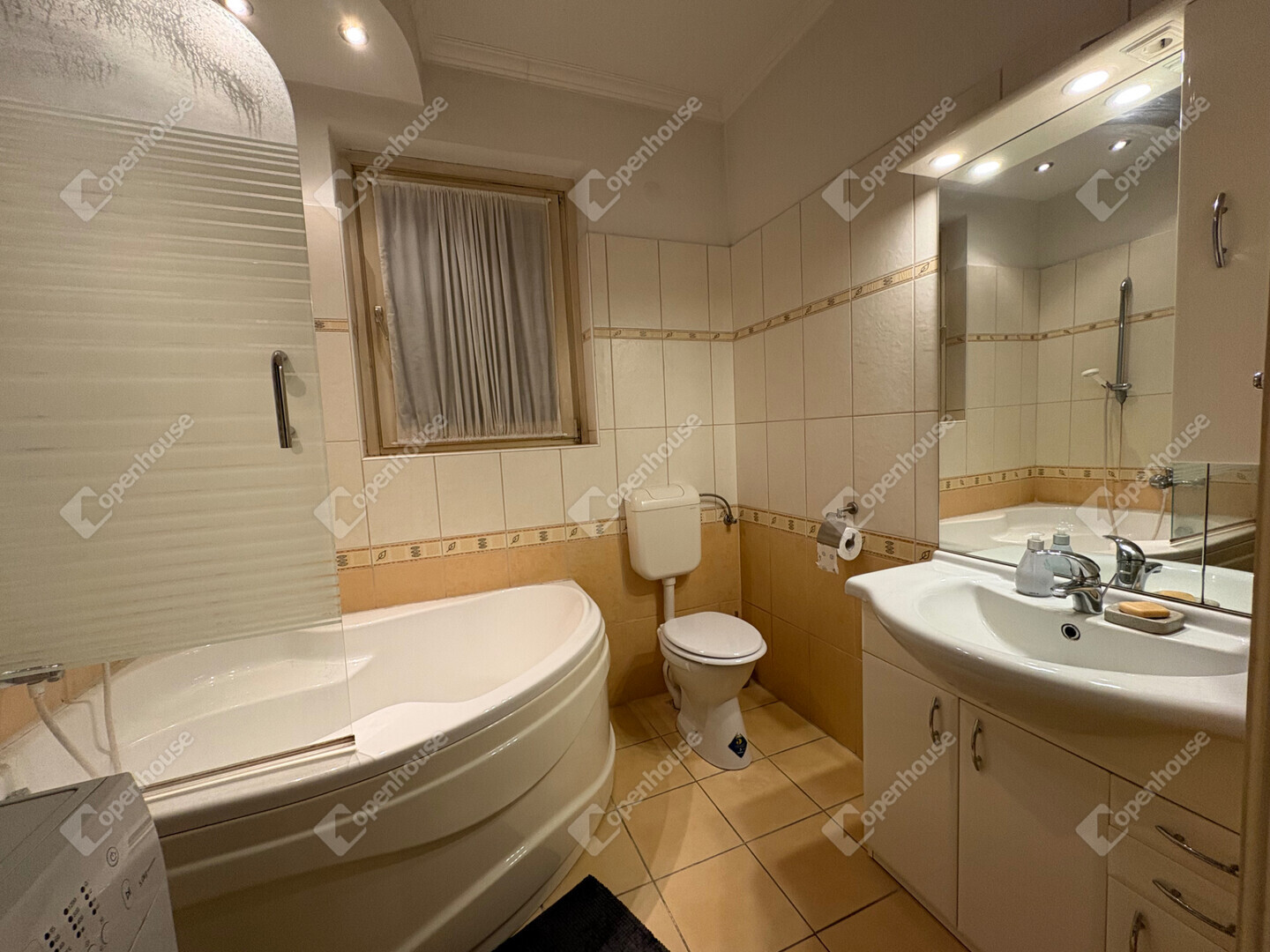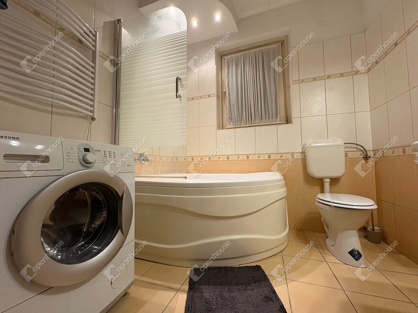 A fürdőszoba ablakos, tágas és sarokkáddal felszerelt.