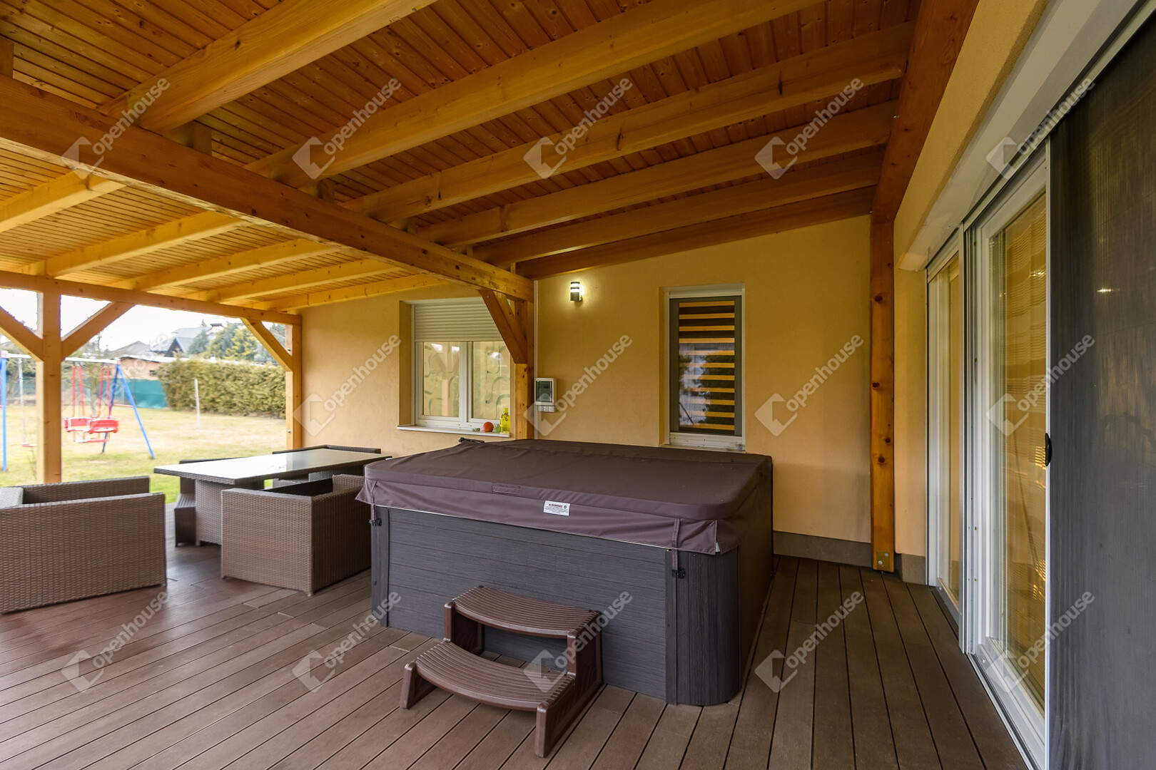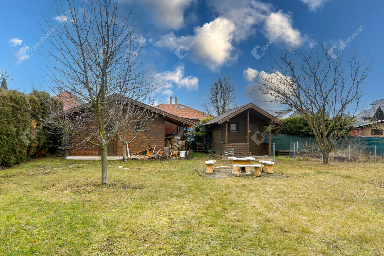 A 40 m2 fedett terasz ideális helyszíne lehet családi/ baráti összejöveteleknek, a kert végében pedig 2 db praktikus faház kapott helyet.