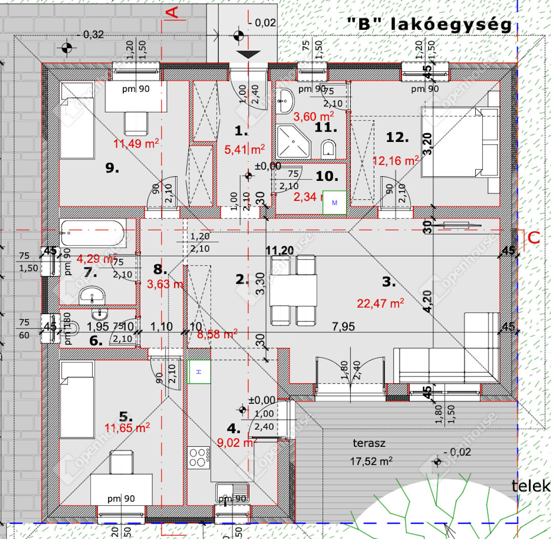 97 m²-es családi ház + 18 m² épített terasz kerámia burkolattal,