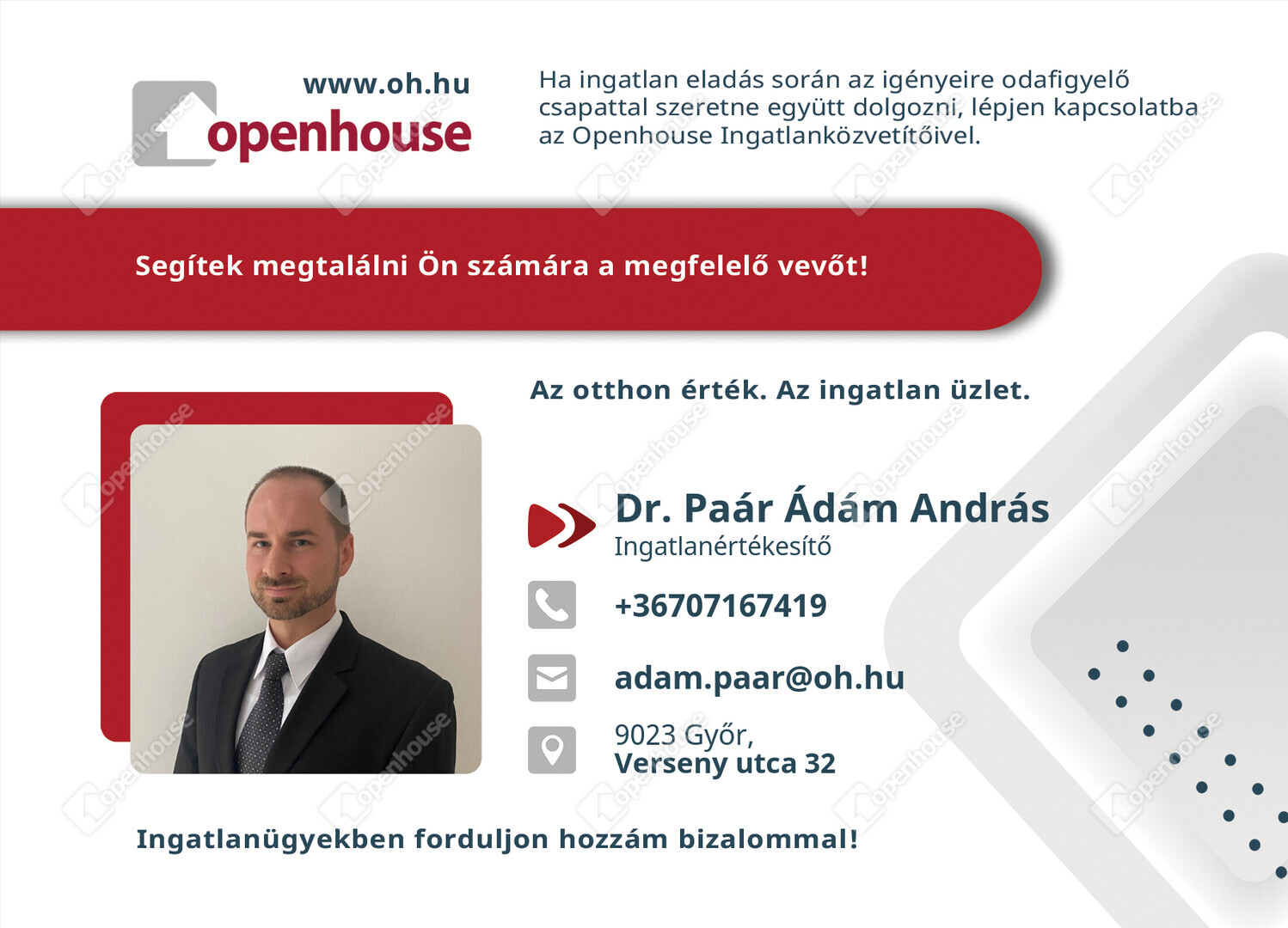 Az Openhouse Center - Győr Ingatlaniroda tagjaként várom Önt az országos hálózatunk teljes kínálatával.