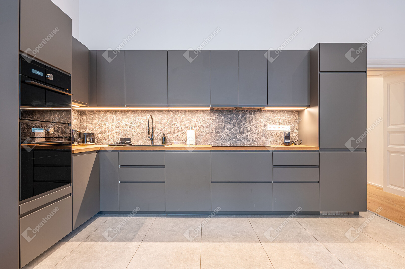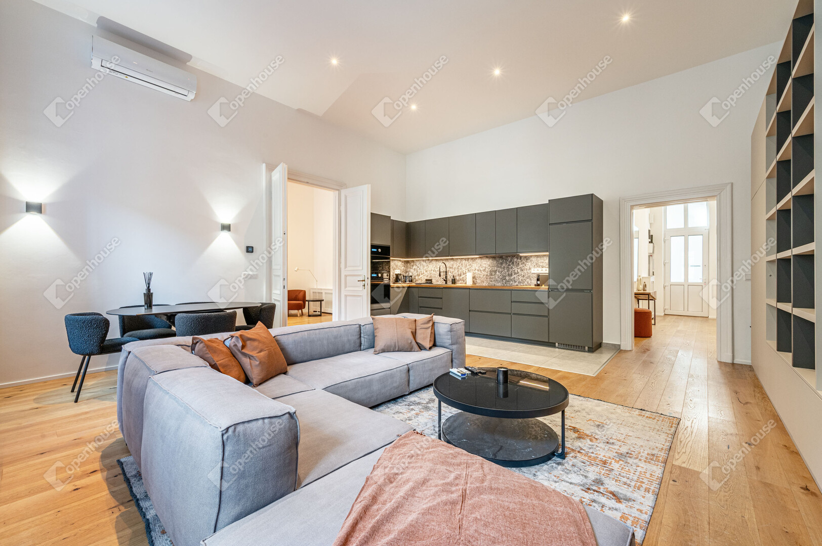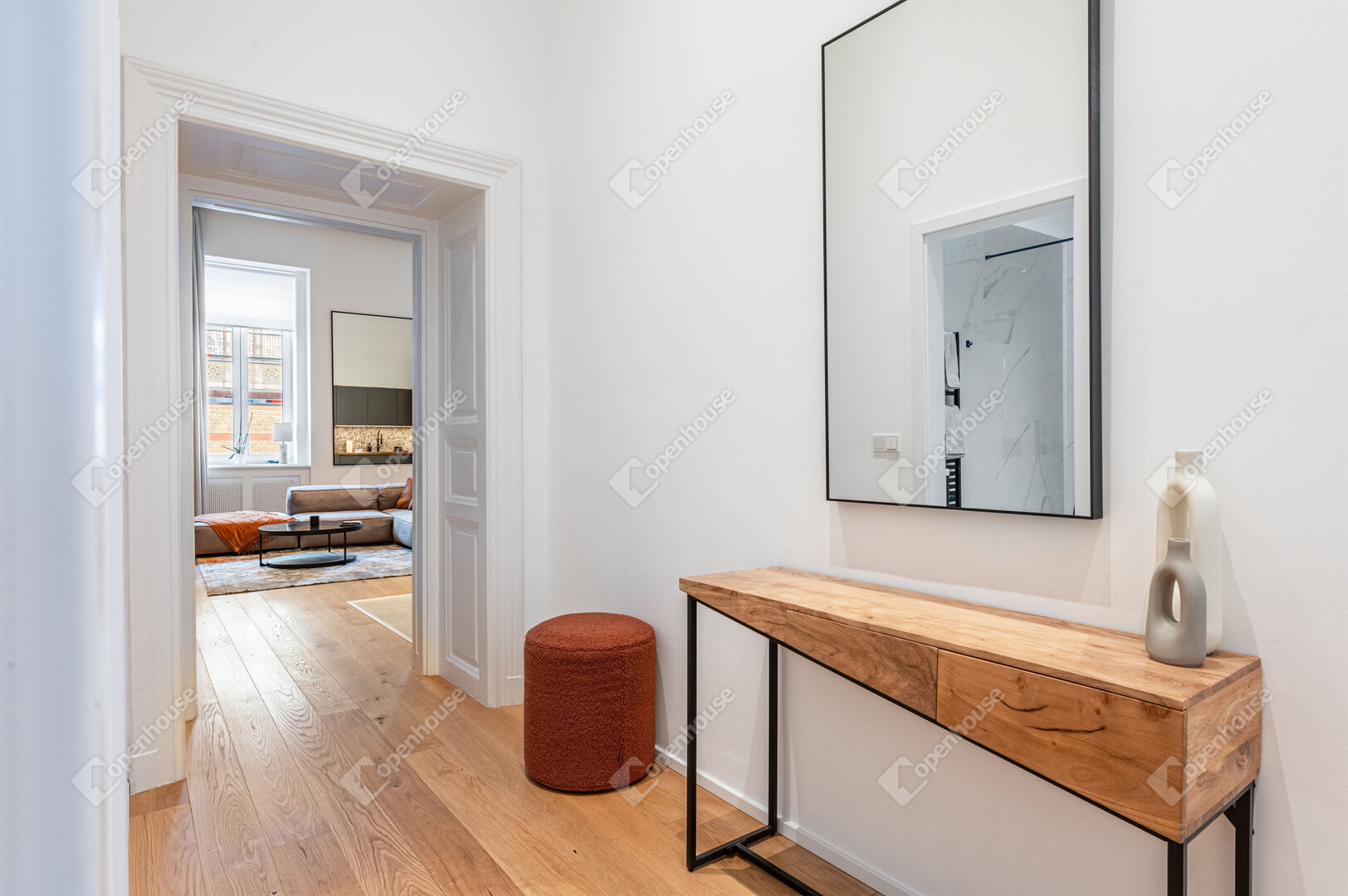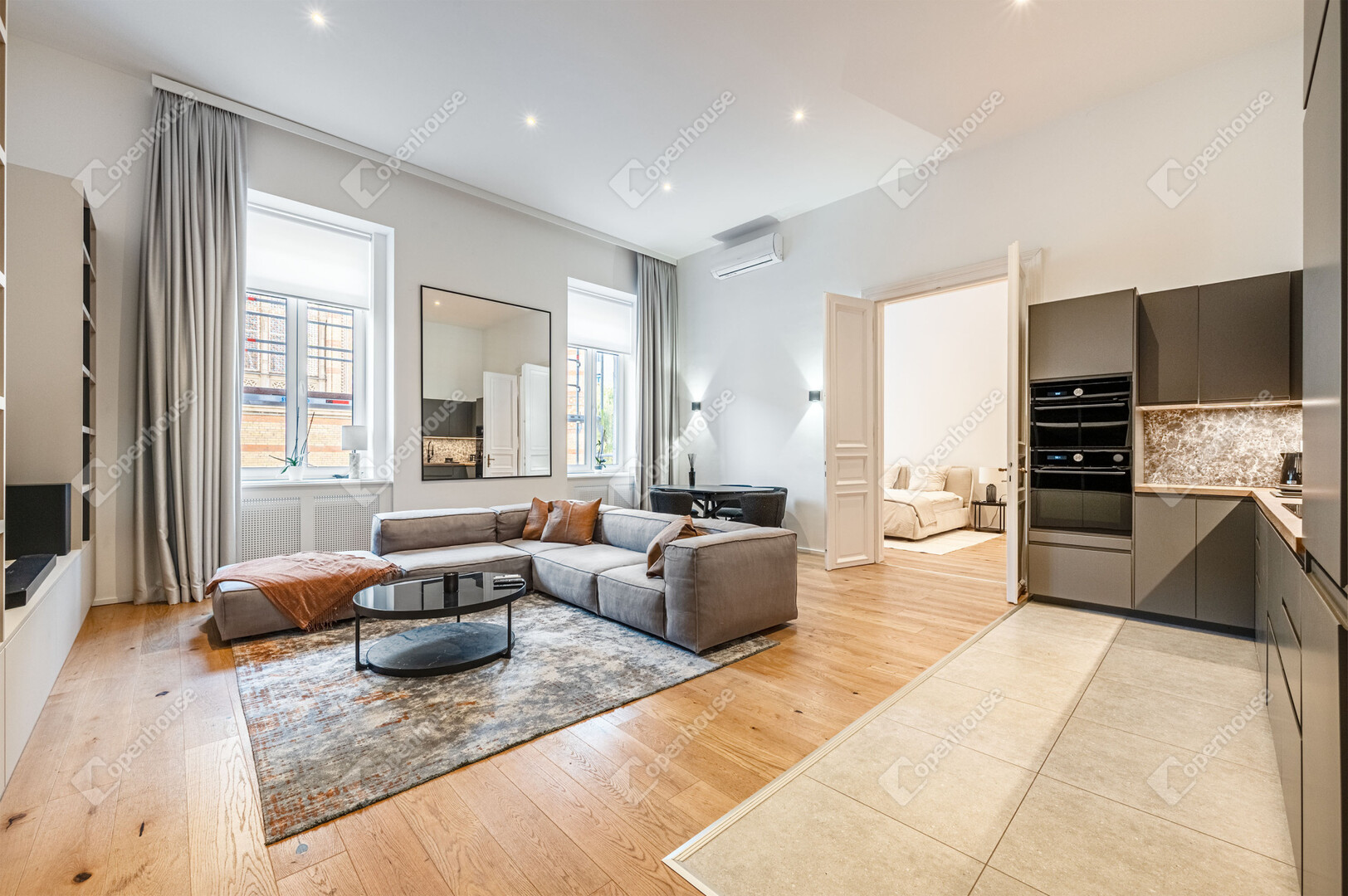 Világos terek, modern belső, klasszikus városi környezetben.