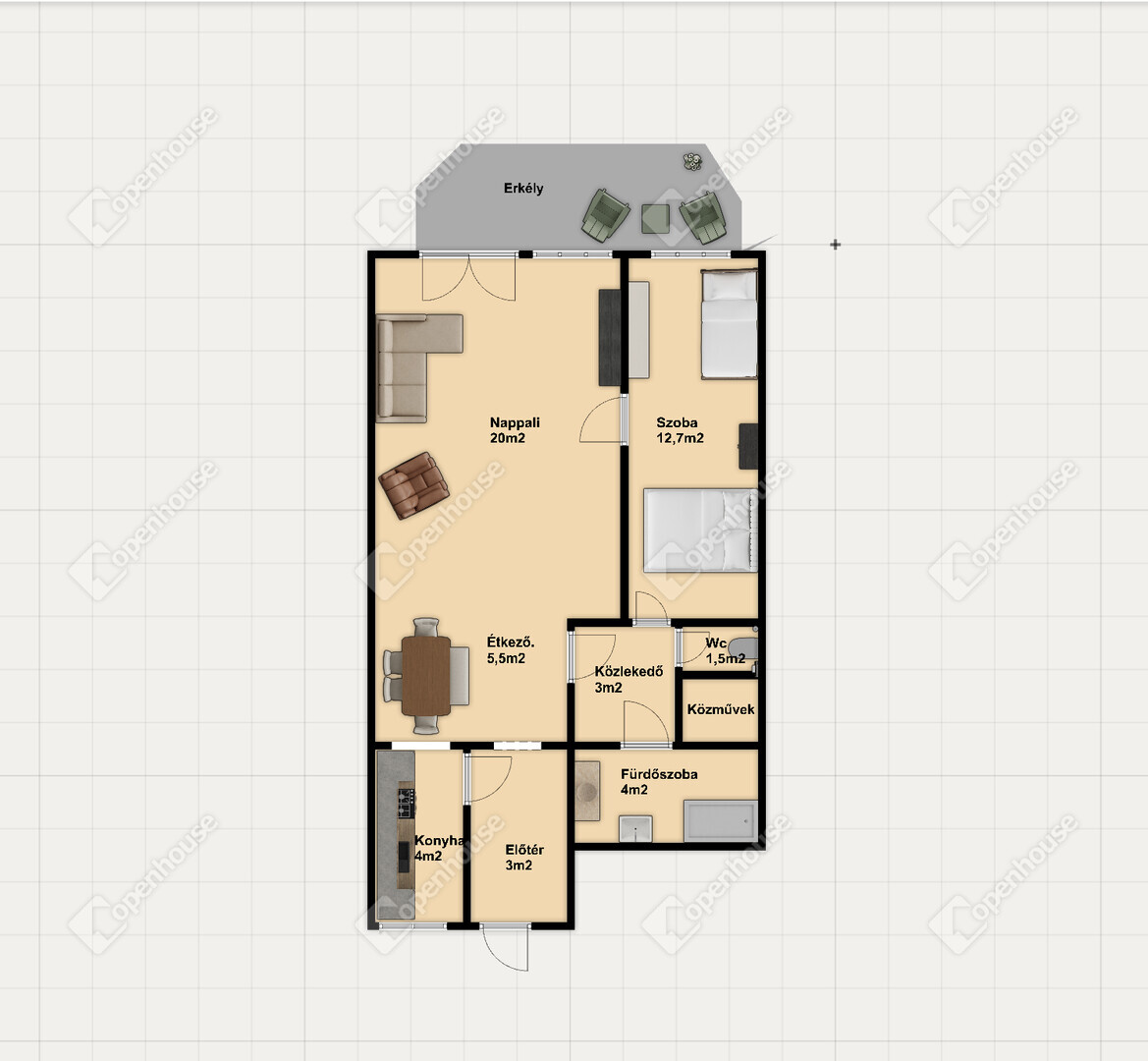 | Közlekedő | 3.00 m2 | Laminált padló |
