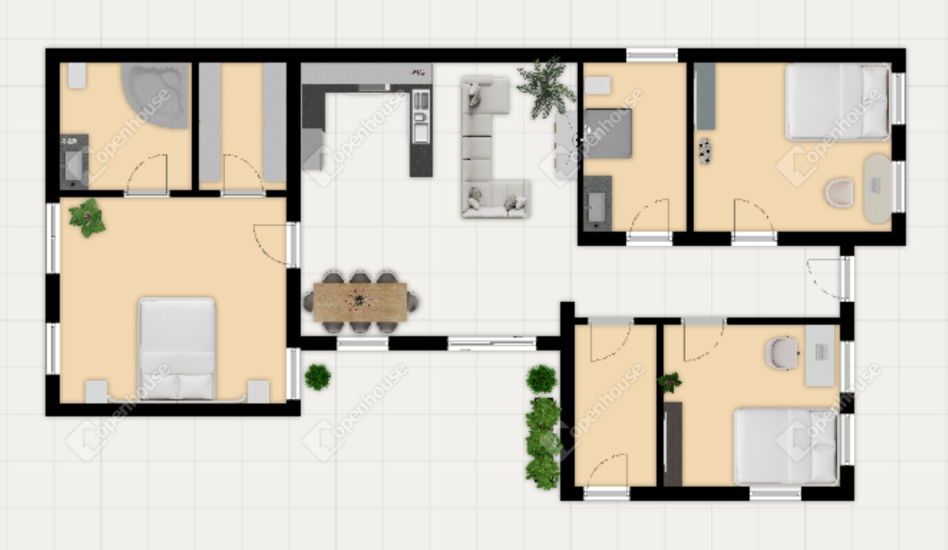 Elrendezése: 3 hálószoba és egy amerikaikonyhás nappali, mely közvetlen terasz és kertkapcsolattal rendelkezik. A terasz a maga 16nm-es méretével kiválóan alkalmas reggeli kávézásra, baráti kertipartik helyszínének. A ház dupla komfortos a 2 fürdőszobának köszönhetően, melyből az egyik fürdőkádas, a másik zuhanyzós fürdő. Gardrób és háztartási helyiség is helyet kapott a házon belül, így tágas tereket biztosítva a hálókban és a nappaliban.