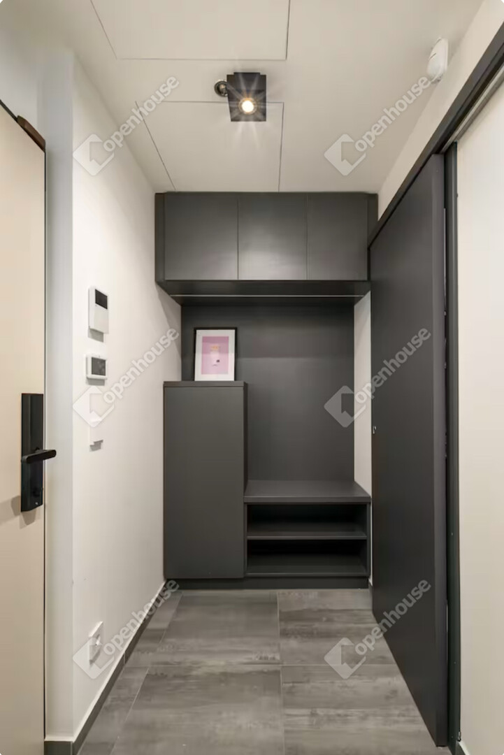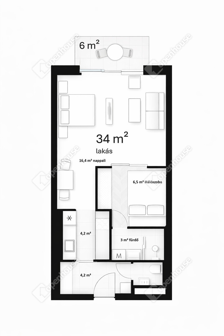 A 34 m²-es otthon igazi „városi okosság”: kompakt, mégis teljes értékű, logikusan felépített térszervezéssel. A belépést követően a közlekedő tisztán vezeti végig a funkciókat, így minden a helyén van, semmi nem véletlen. A konyha galley jellegű kialakítása kifejezetten hatékony: a sötét, matt felületek és a bronzos–kőhatású hátfal együttese modern, karakteres hangulatot ad, miközben a munkapult és a tárolók mennyisége a mérethez képest meglepően praktikus.
