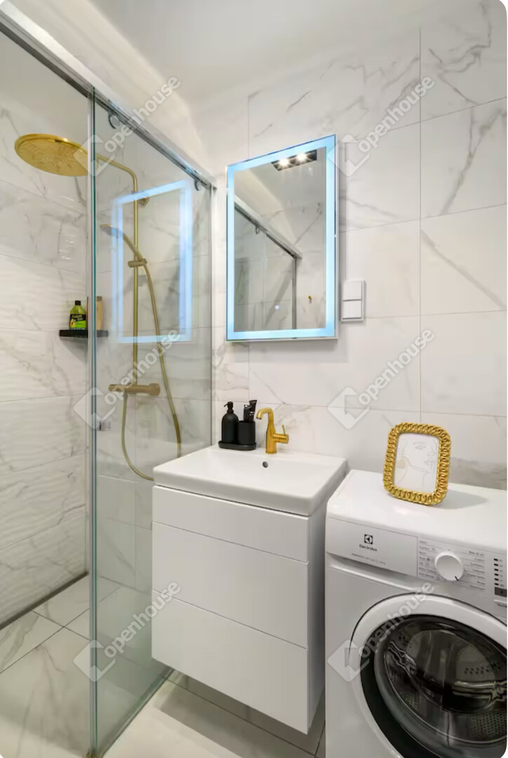 A fürdőszoba igényes, hotel-hangulatú: nagylapos, márványhatású burkolatok, üveg zuhanyfal, arany színű csaptelep és világított tükör adják azt a finom részletgazdagságot, amitől az egész lakás „késznek” érződik.