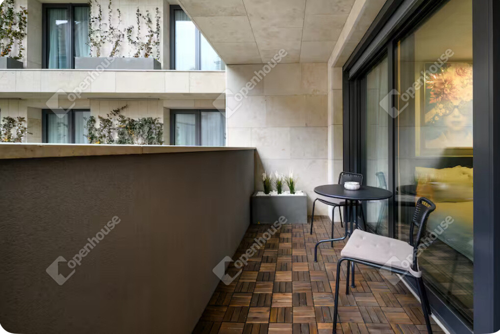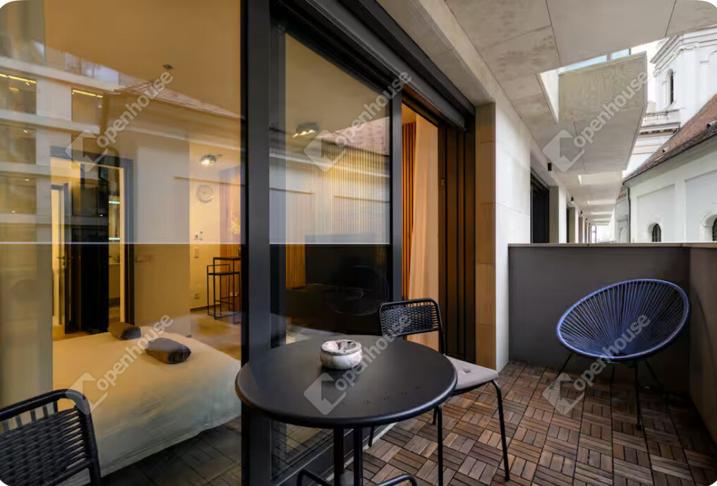 A nappaliból közvetlen kijárat nyílik a 6 m²-es, belső udvarra néző erkélyre, amely a belvárosi elhelyezkedés ellenére visszafogott, intimebb környezetet biztosít.