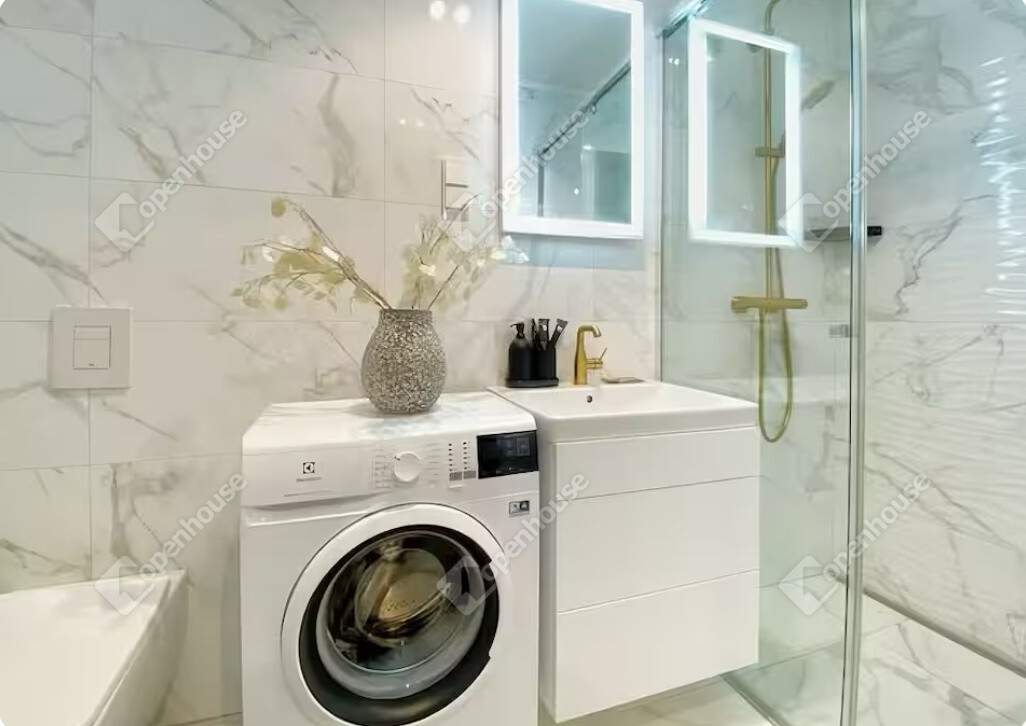 A fürdőszoba igényes, hotel-hangulatú: nagylapos, márványhatású burkolatok, üveg zuhanyfal, arany színű csaptelep és világított tükör adják azt a finom részletgazdagságot, amitől az egész lakás „késznek” érződik.