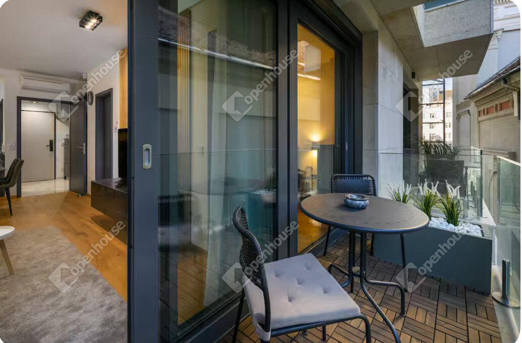 A nappaliból közvetlen kijárat nyílik a 5 m²-es, belső udvarra néző erkélyre, amely a belvárosi elhelyezkedés ellenére visszafogott, intimebb környezetet biztosít.