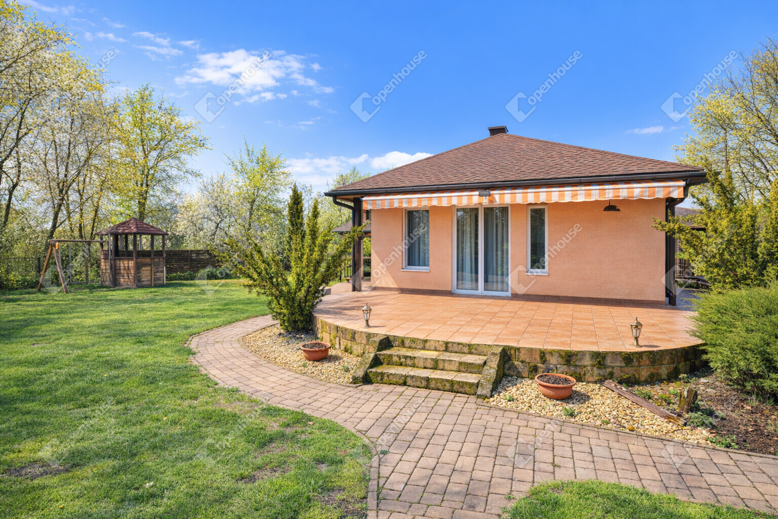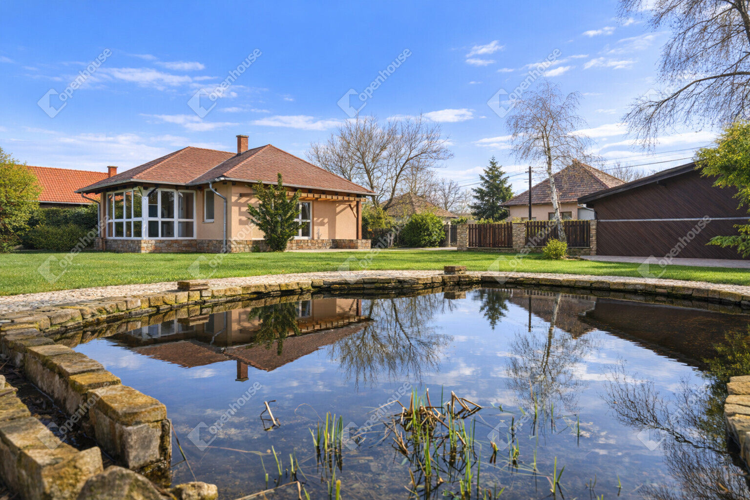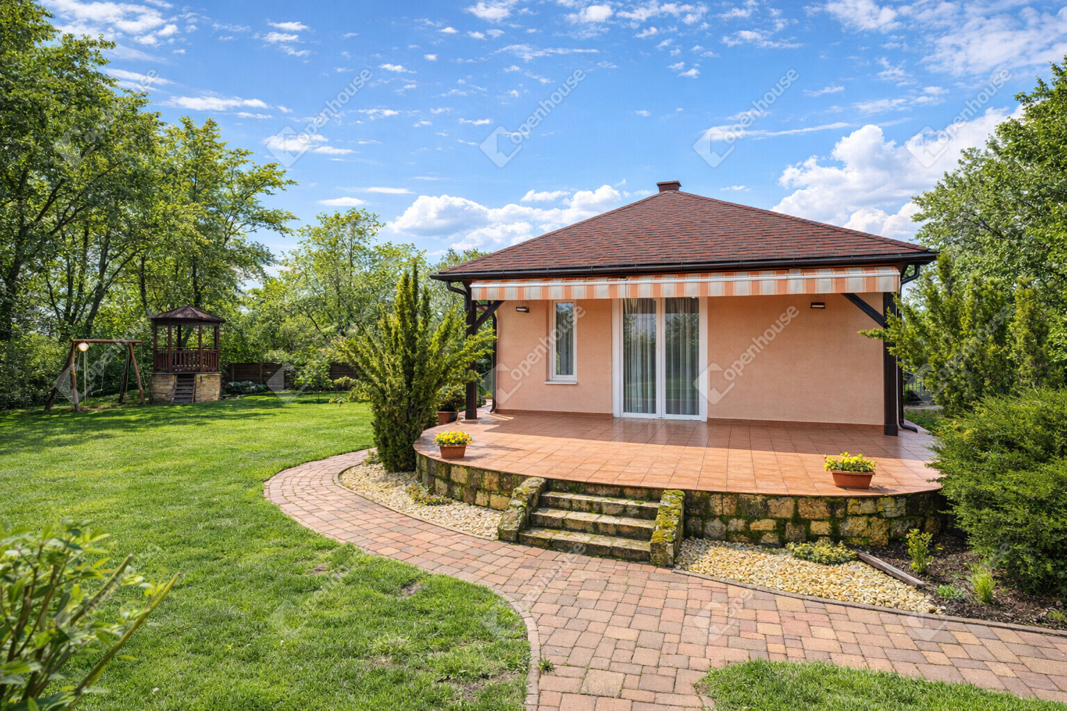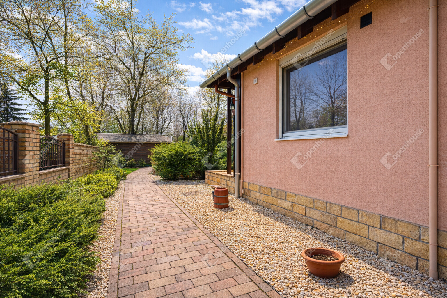 A gondozott, tágas telek kiváló lehetőséget biztosít pihenésre, családi programokra vagy baráti összejövetelekre.