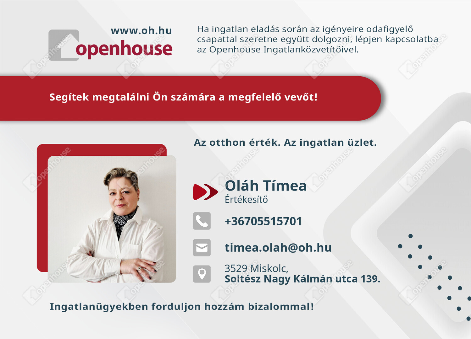 Az Openhouse Miskolc Soltész Nagy Kálmán utcai Ingatlaniroda tagjaként várom Önt az országos hálózatunk teljes kínálatával.