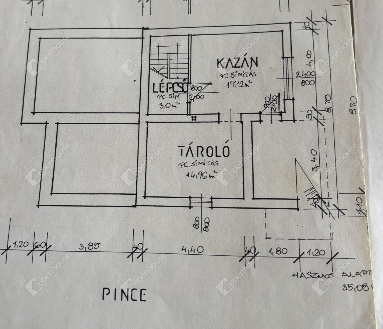 A 3 szintes lakóház pinceszintjén kazánház, méretes tároló ( hobby műhely) található.
