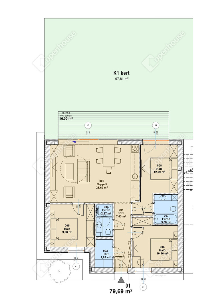 | Háztartási helyiség | 3.00 m2 | Járólap |