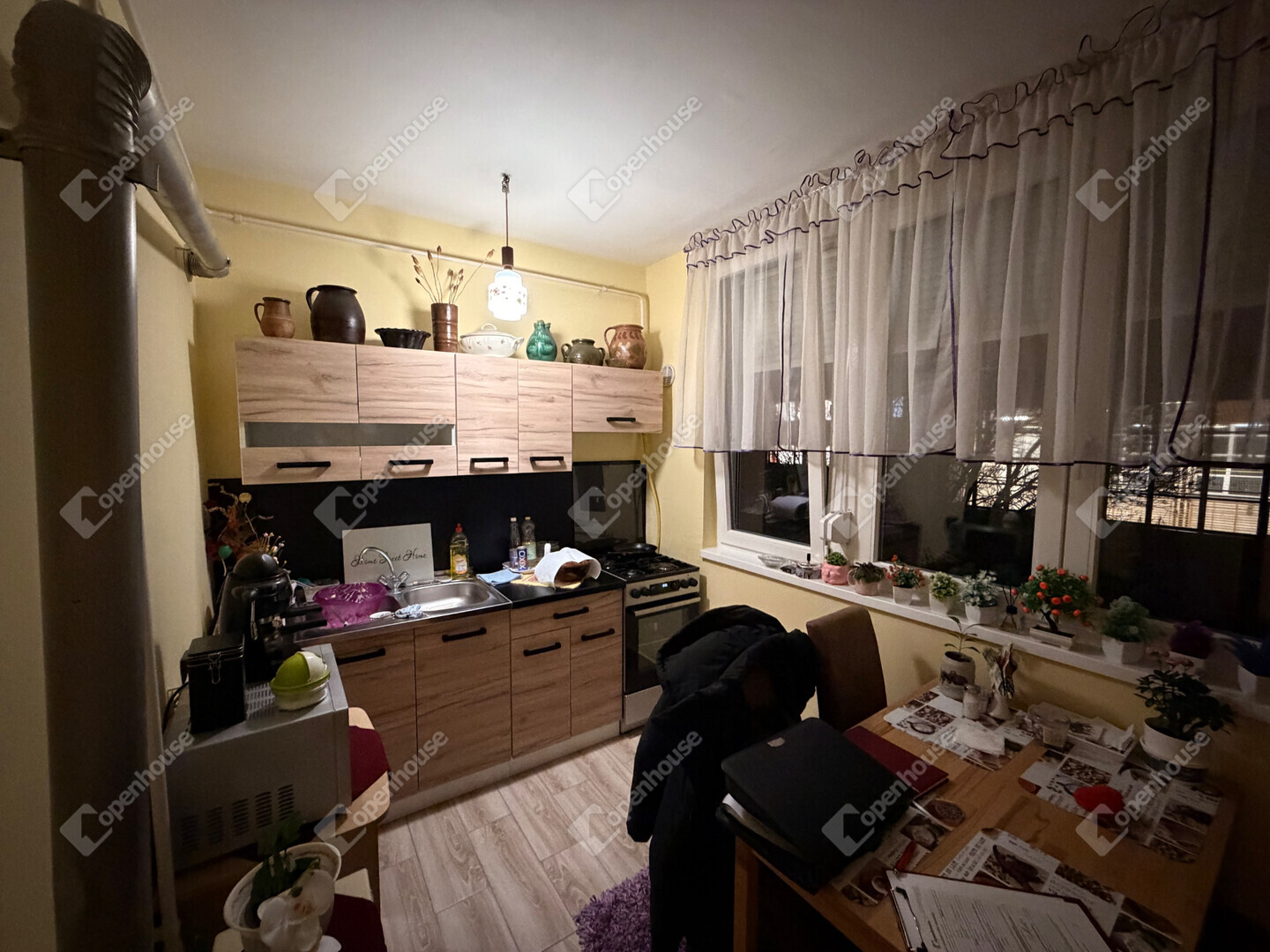 A déli fekvésnek köszönhetően a lakás rendkívül világos és hangulatos. A fűtést gázkonvektorok biztosítják.