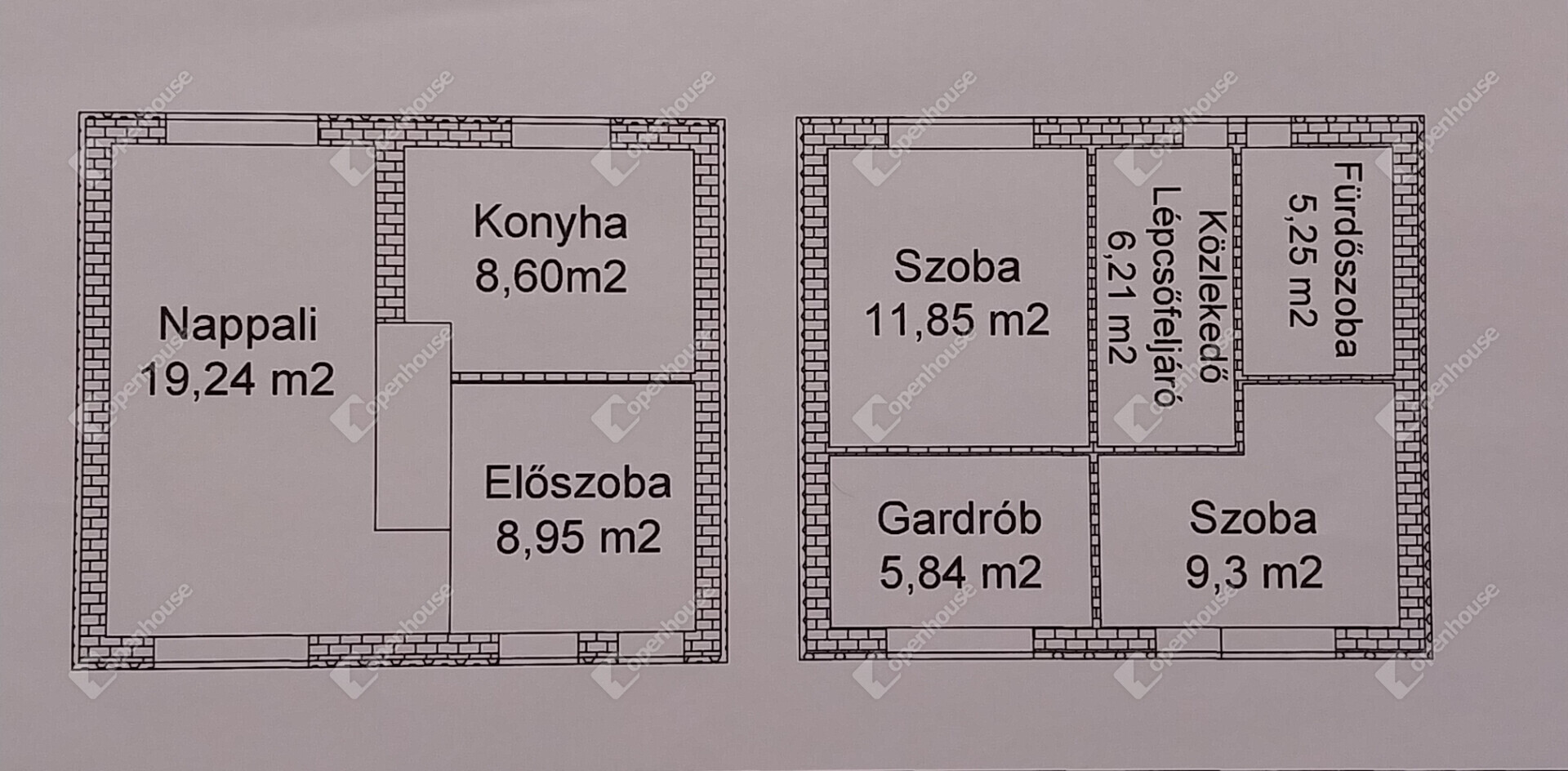 - Emelet: 2 szoba + 1 gardrób + közlekedő + fürdő/WC
