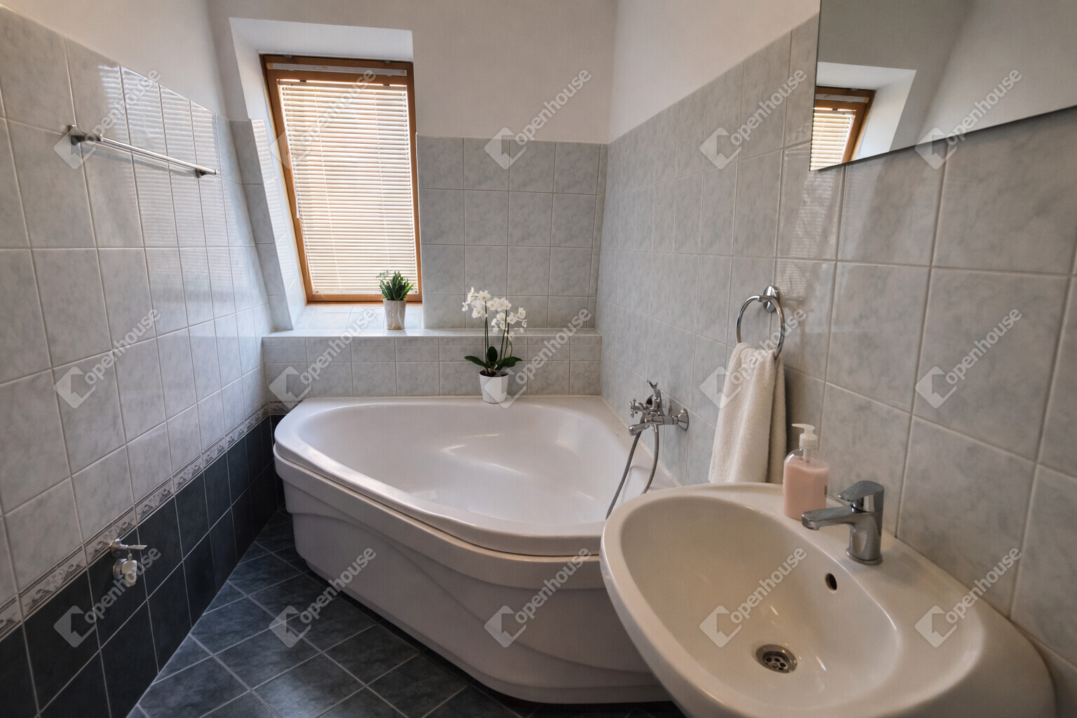 Az elrendezés kifejezetten praktikus: a közösségi terek és a privát élettér jól elkülönülnek, ezért többgyermekes család számára is kényelmes, de home office kialakítására is tökéletes.