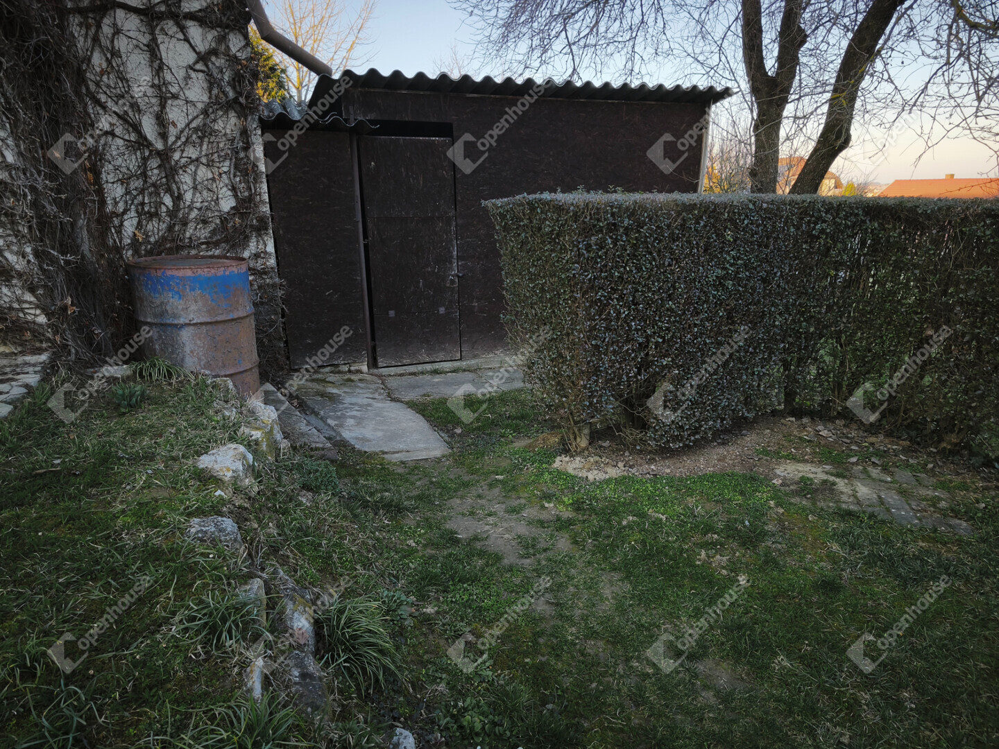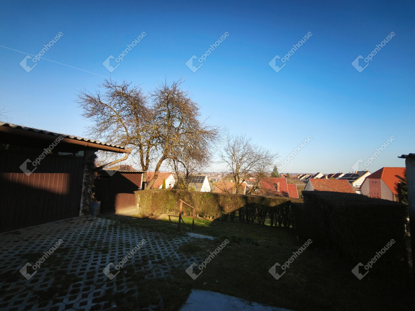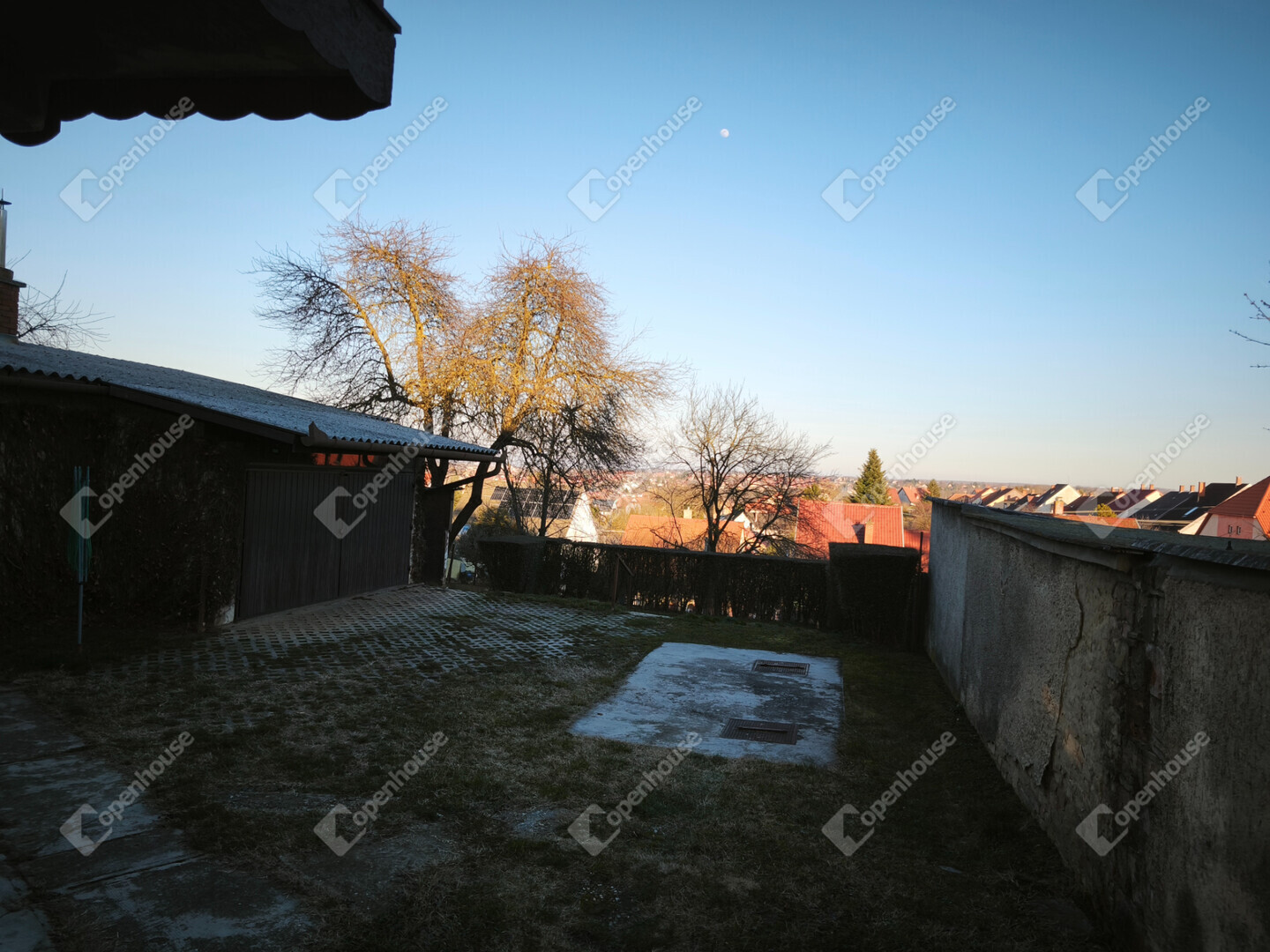 A telek 614 m2, gondozott kertjében gyümölcsfák találhatók, a kocsibeálló gyeptéglás.