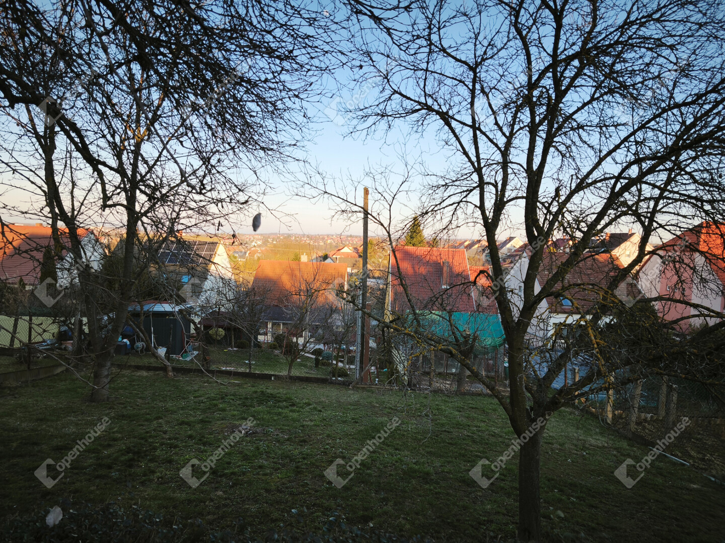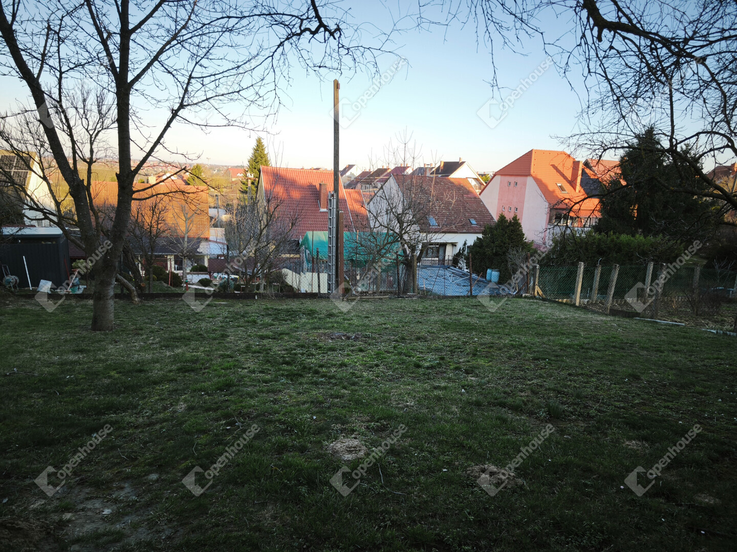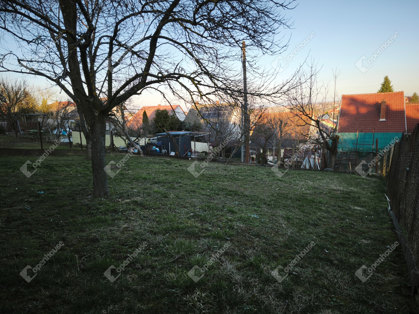 A telek 614 m2, gondozott kertjében gyümölcsfák találhatók, a kocsibeálló gyeptéglás.