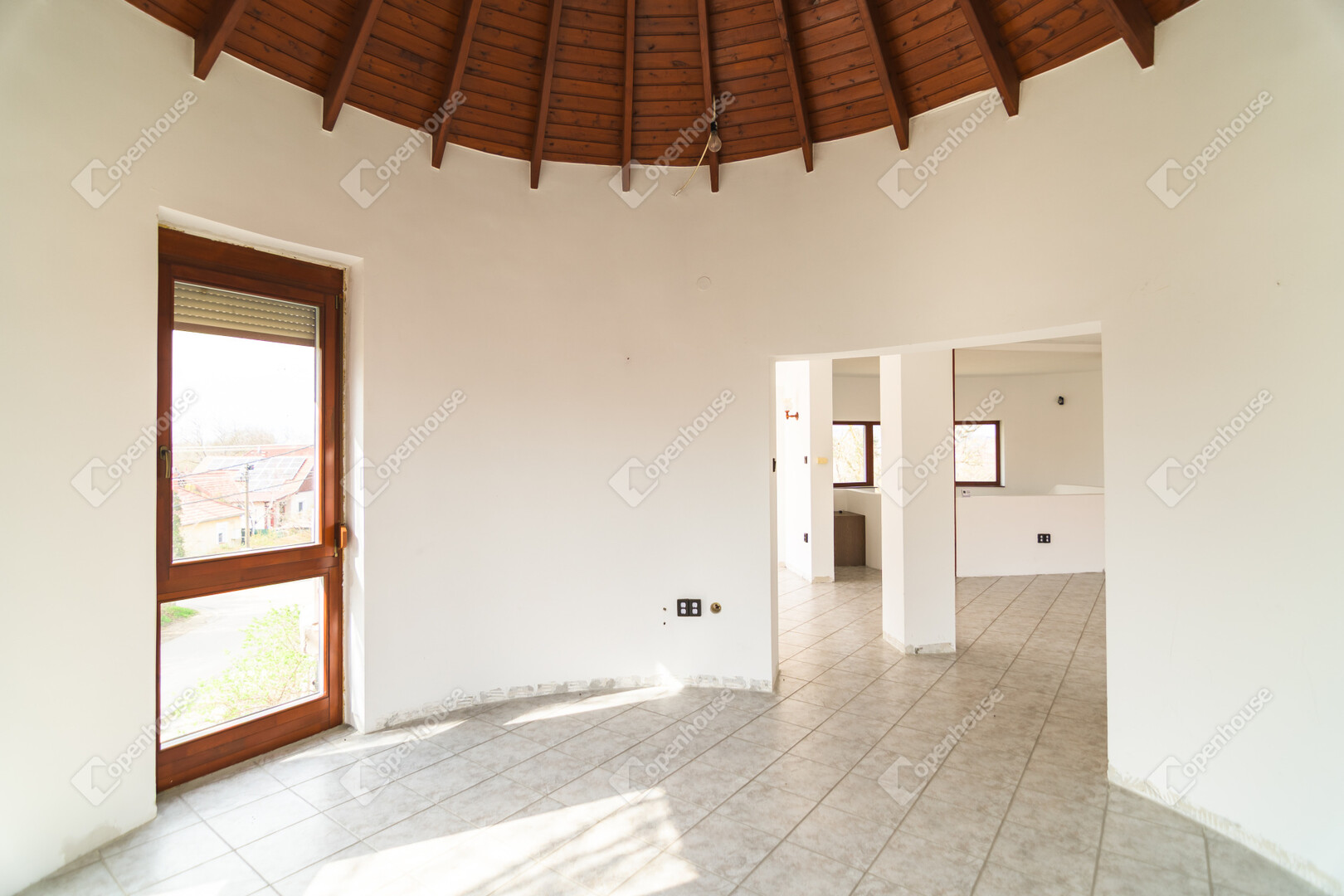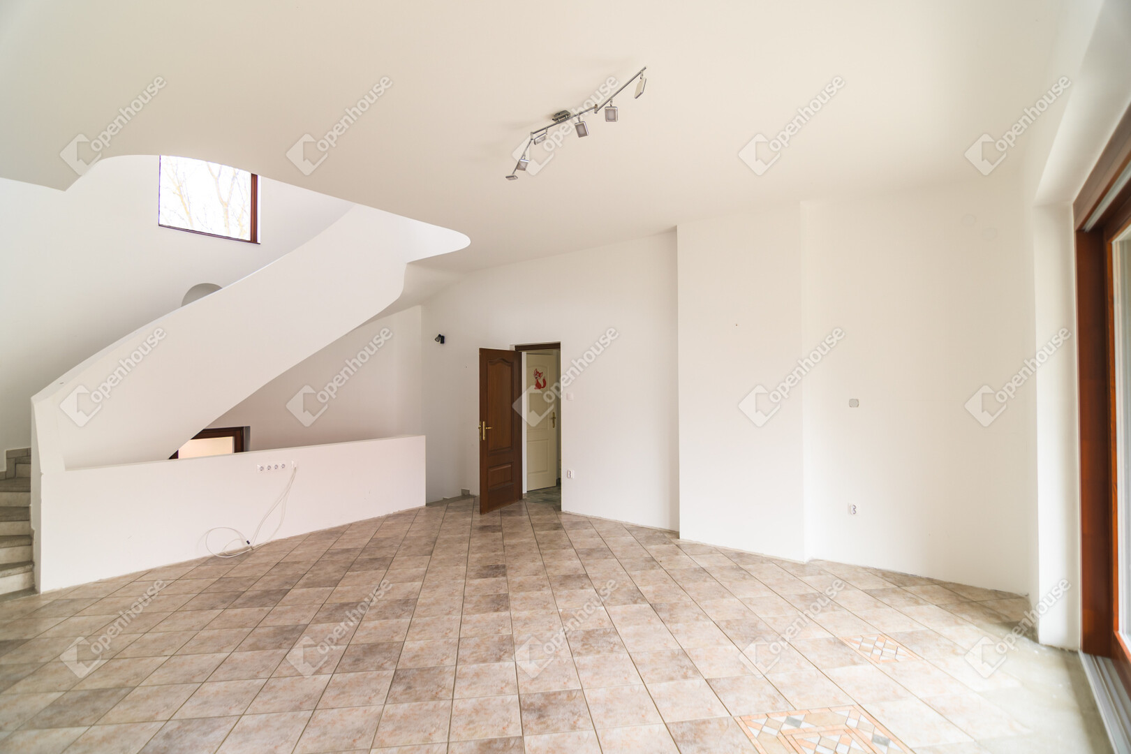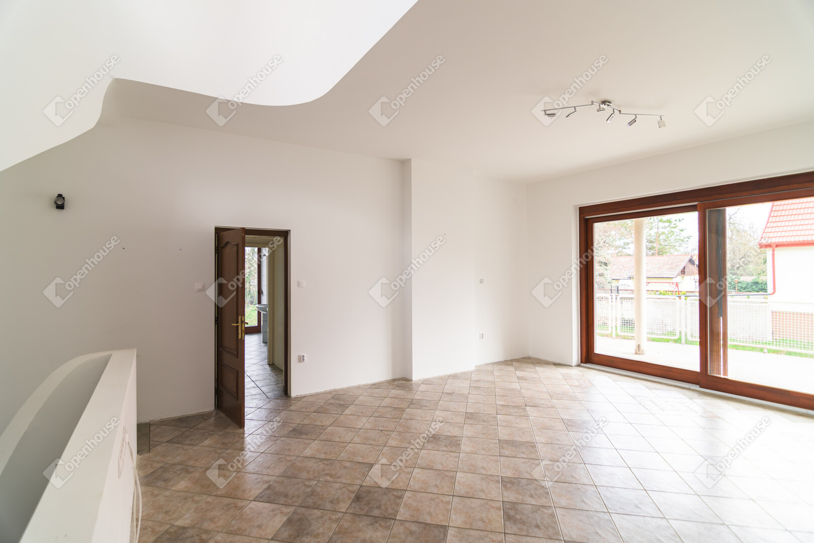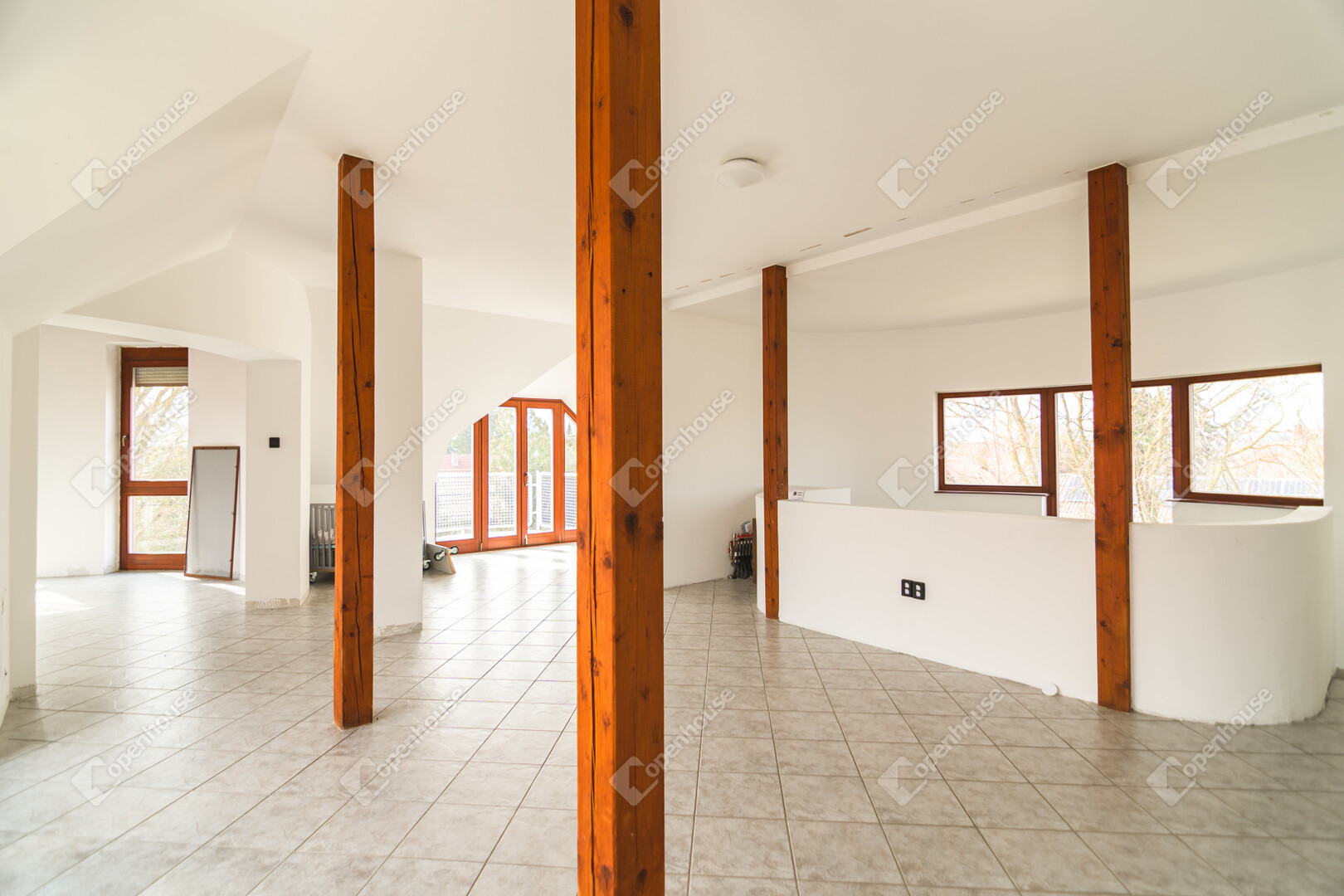 Az első emeleten jelenleg egy 61,4 m²-es egybefüggő nappali tér található, ugyanazokkal a félköríves, nagy üvegfelületekkel, mint a földszinten.