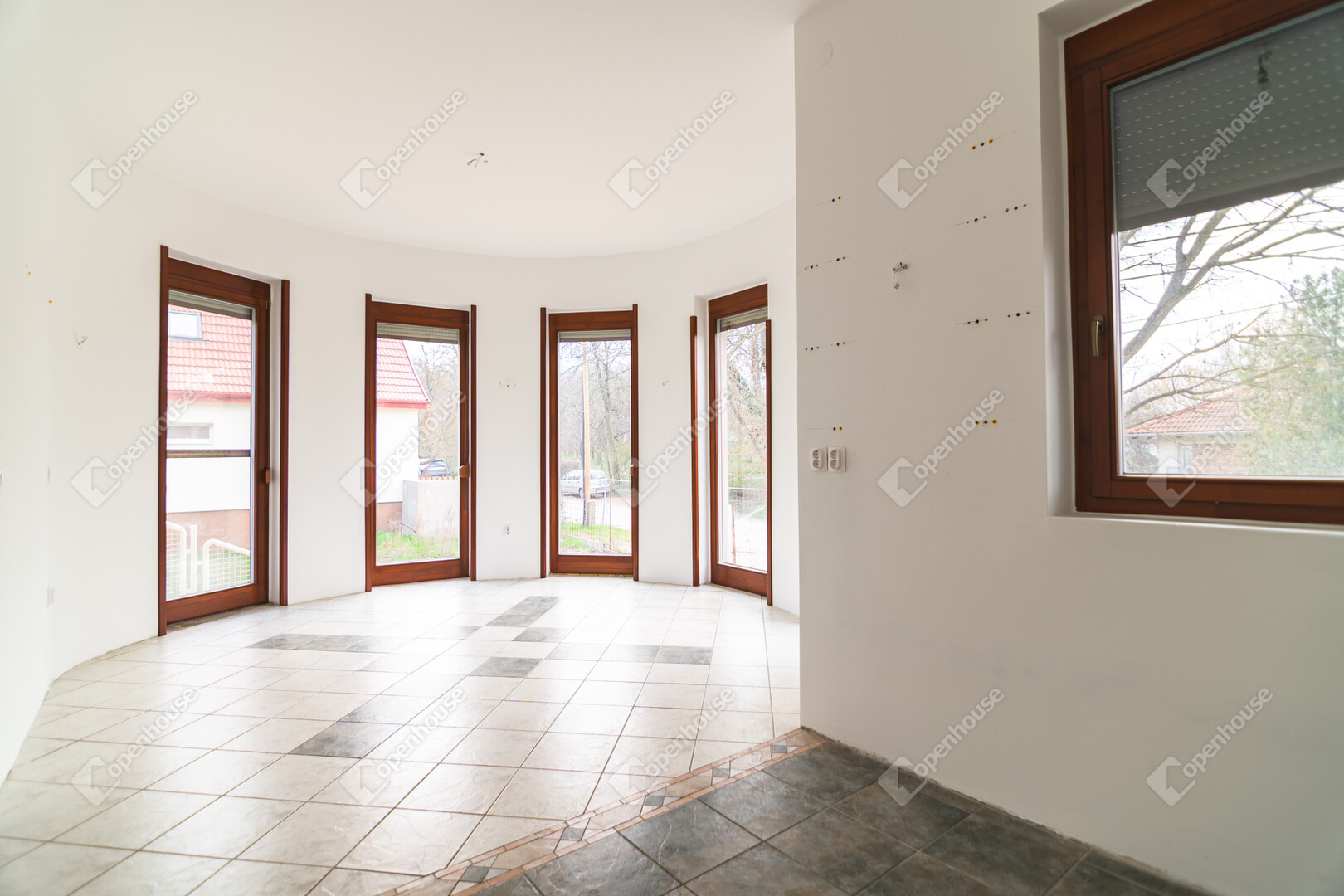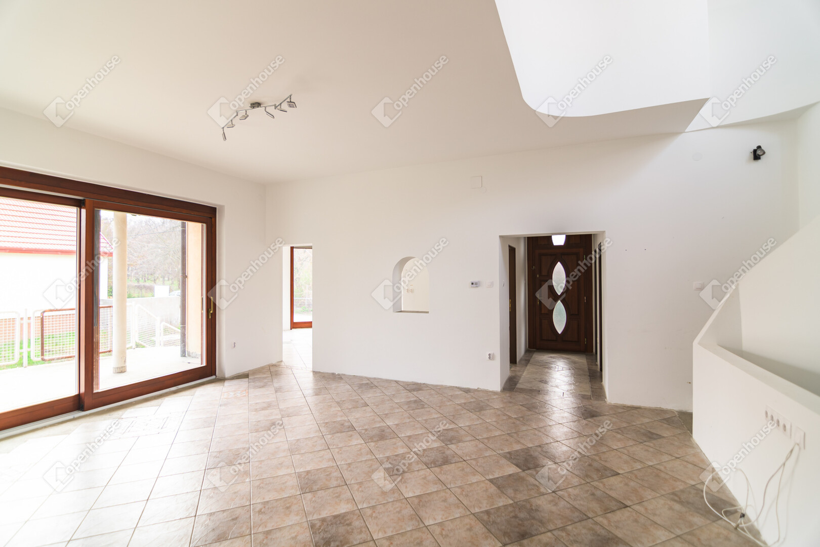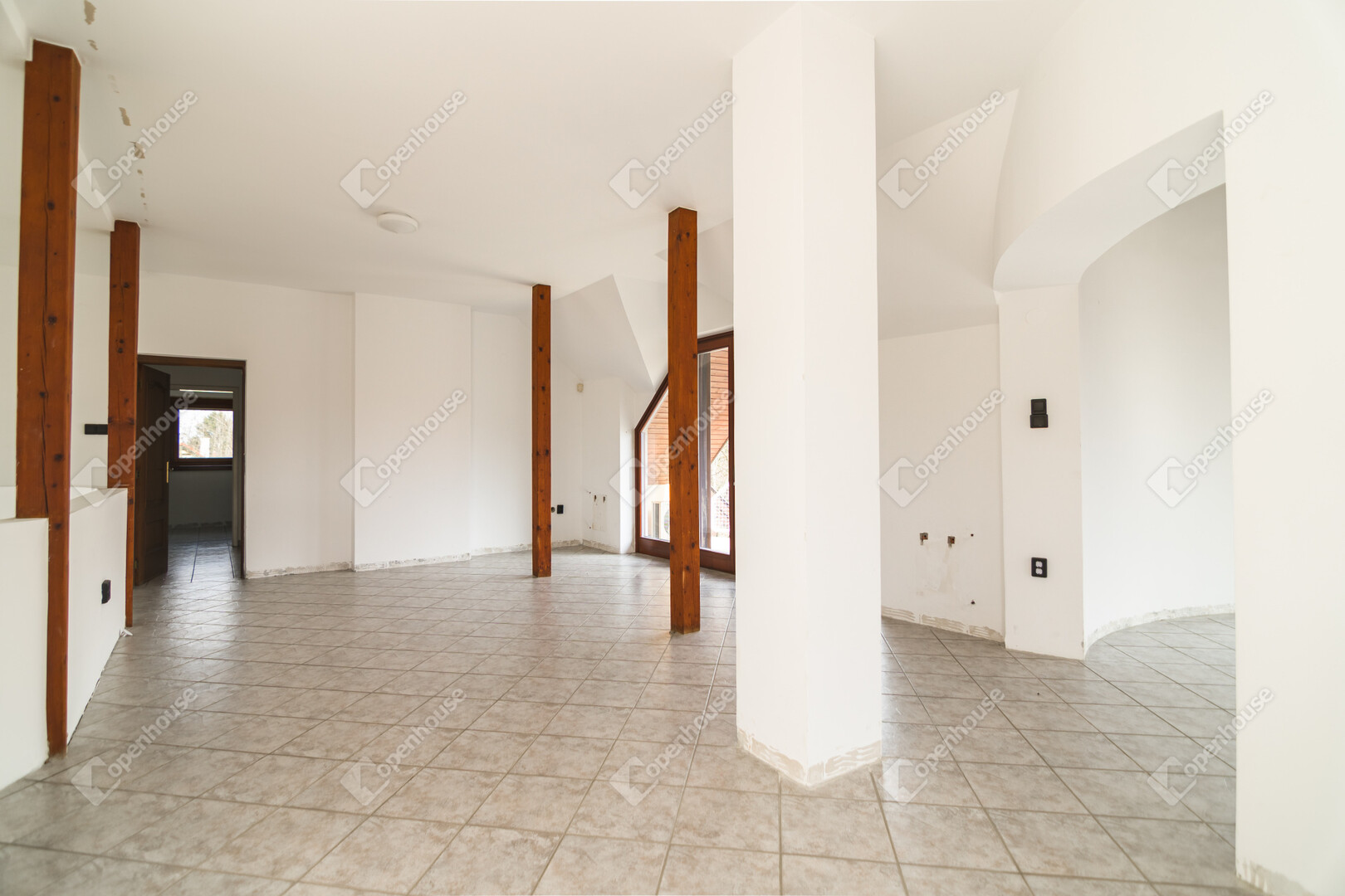 Az első emeleten jelenleg egy 61,4 m²-es egybefüggő nappali tér található, ugyanazokkal a félköríves, nagy üvegfelületekkel, mint a földszinten.