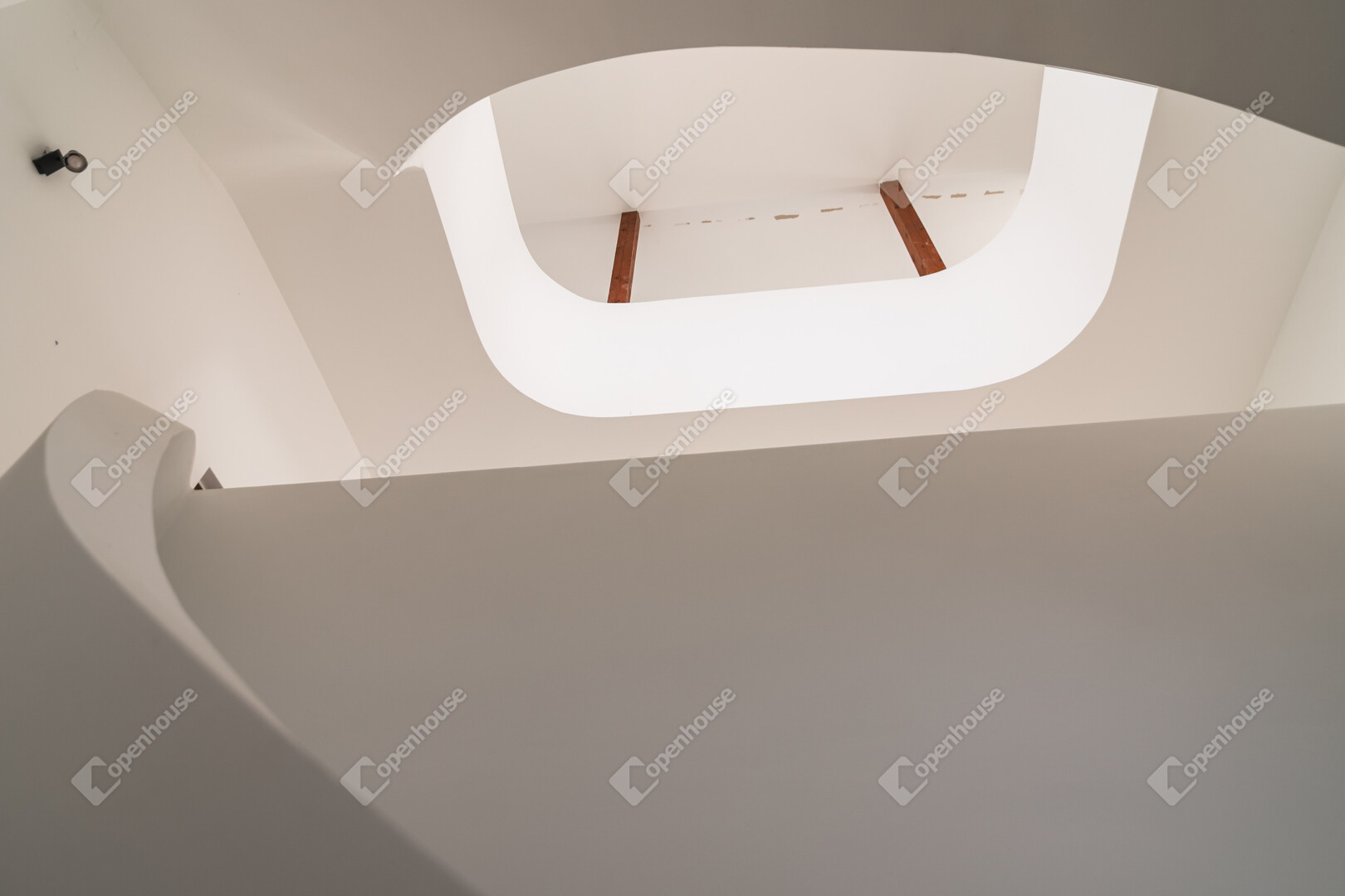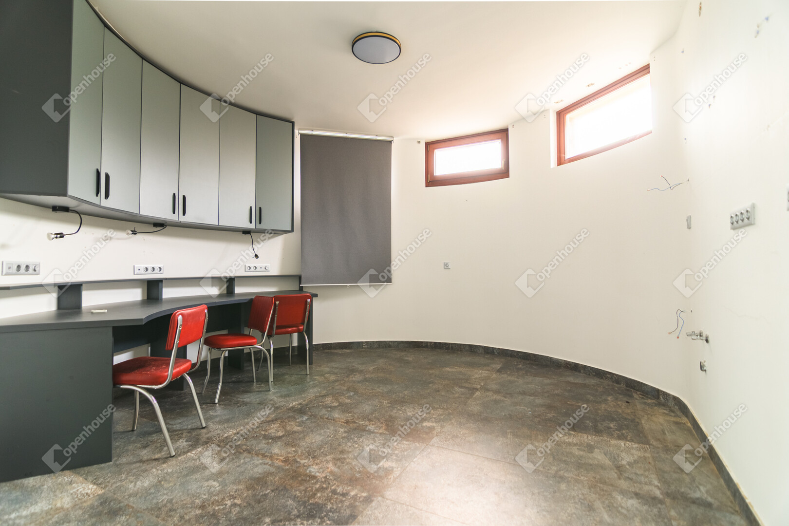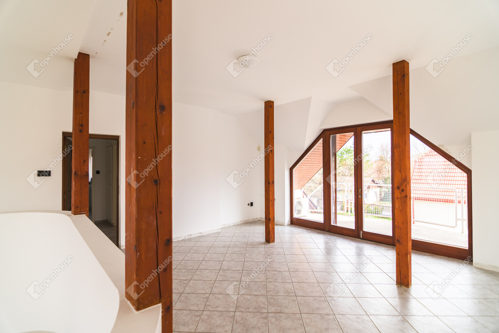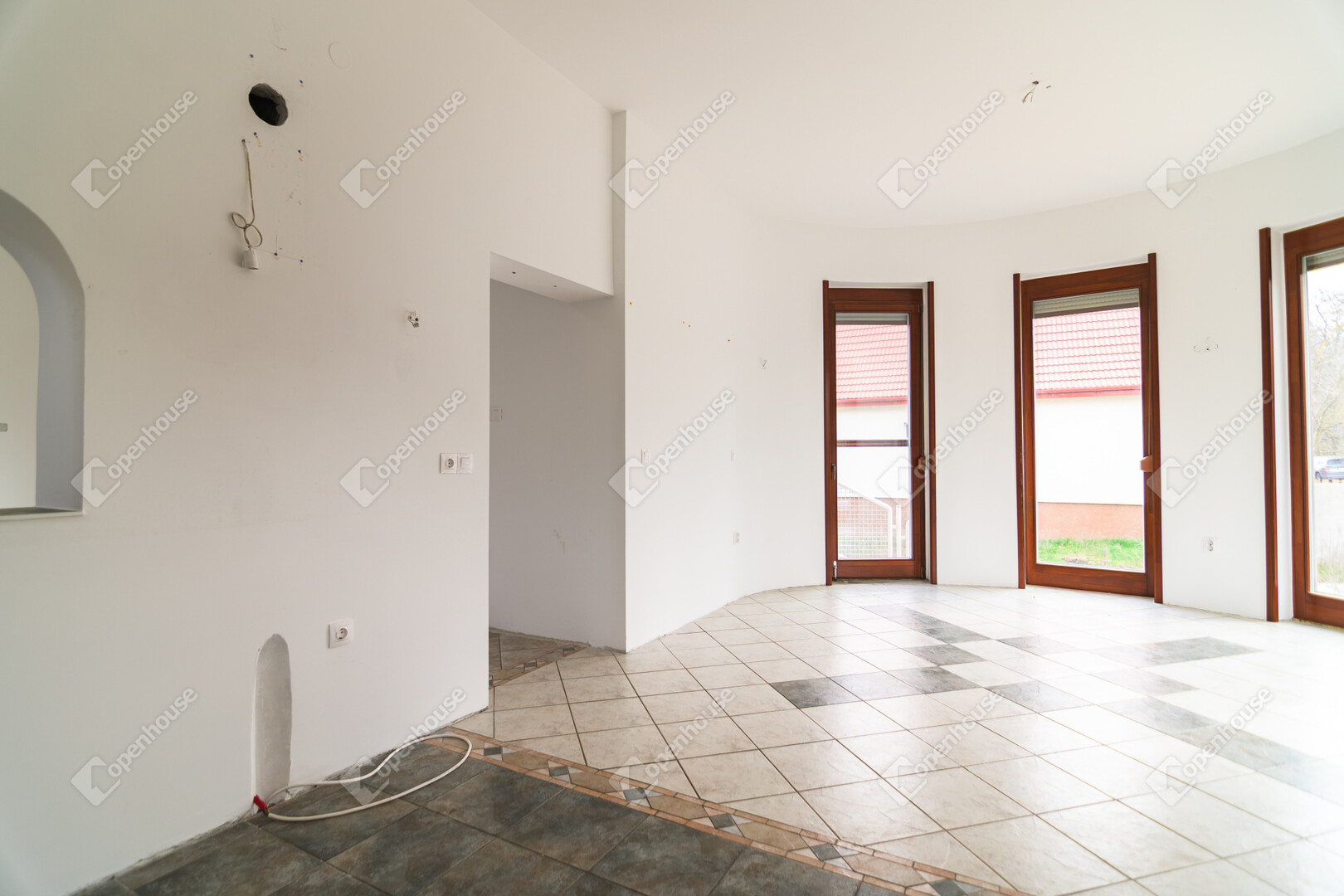 Az első emeleten jelenleg egy 61,4 m²-es egybefüggő nappali tér található, ugyanazokkal a félköríves, nagy üvegfelületekkel, mint a földszinten.