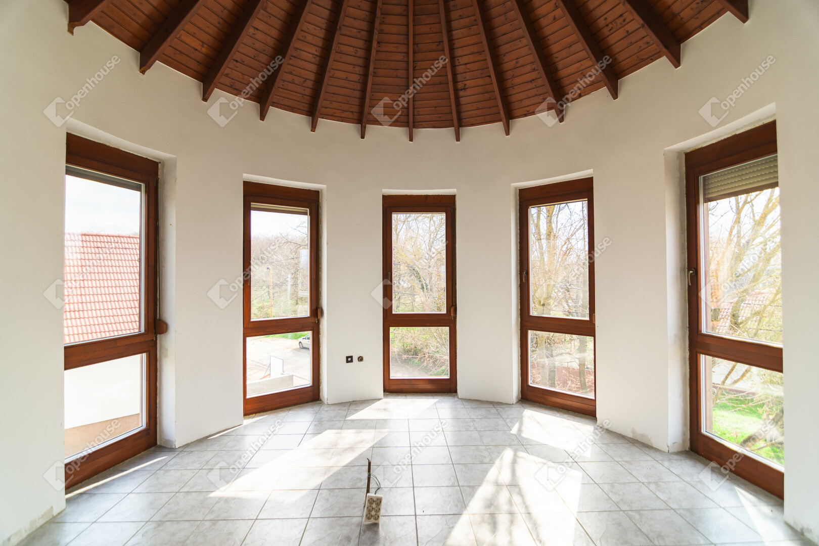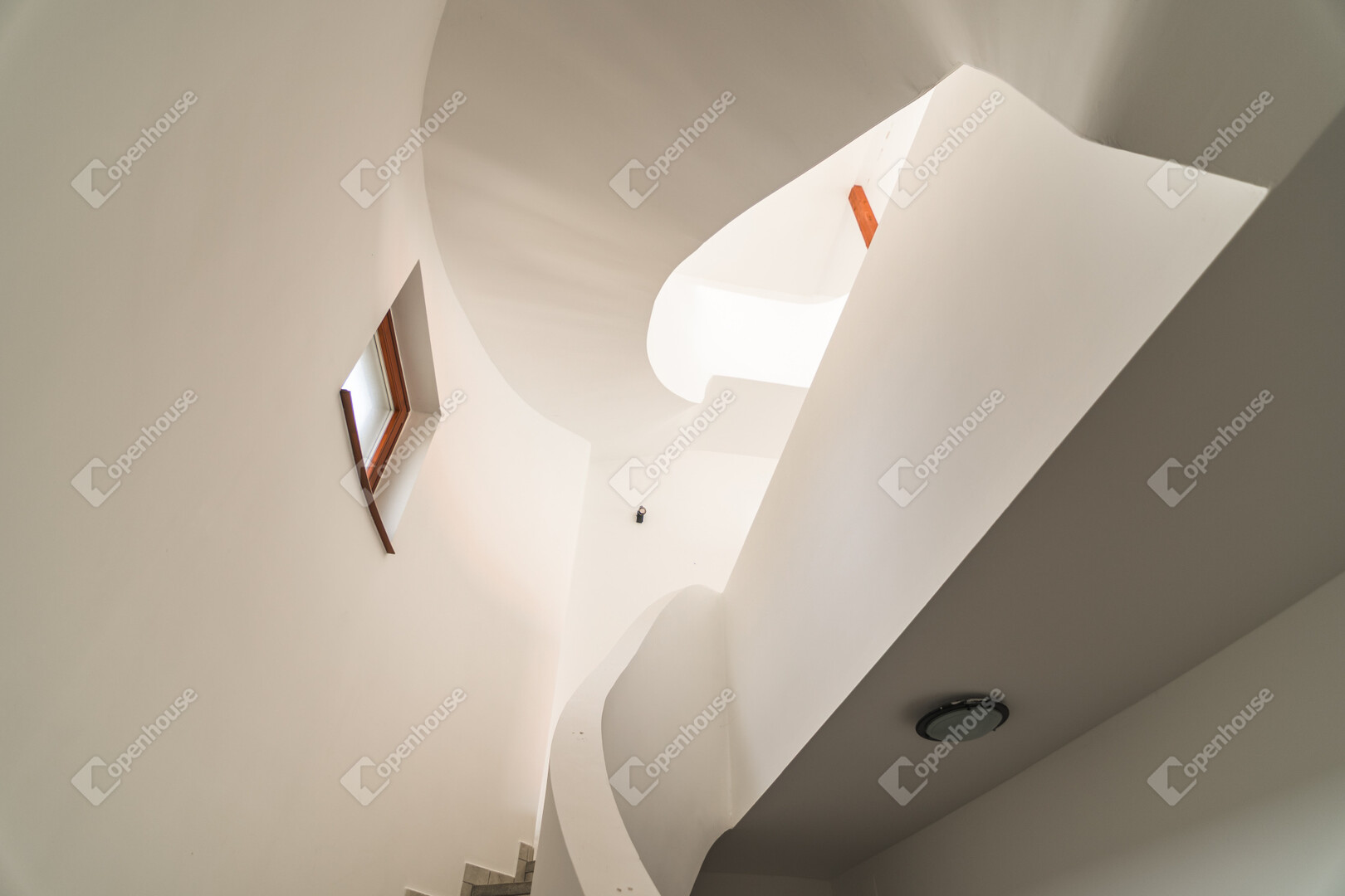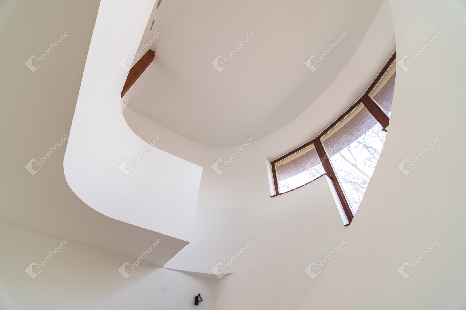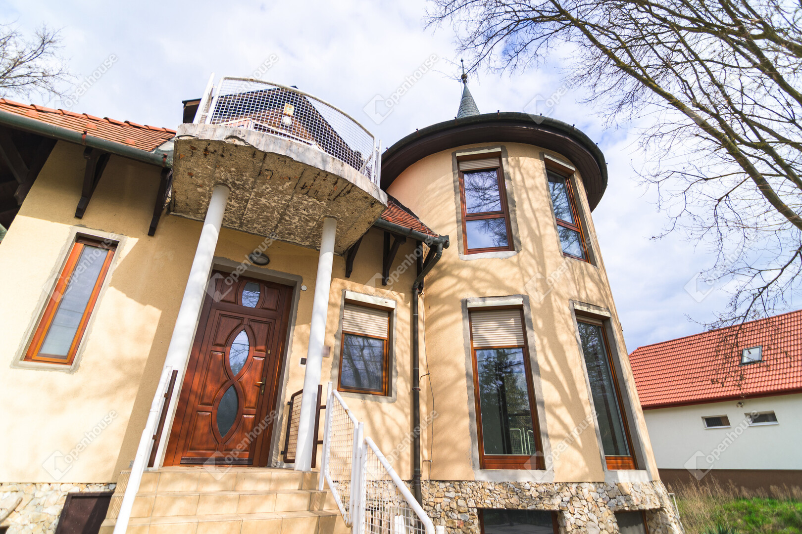 A ház már kívülről is figyelemfelkeltő: tornyos kialakítása, egyedi arányai és karakteres megjelenése különleges arculatot ad az ingatlannak. Belül a térformálás szinte szoborszerű: a csigaszerű, exkluzív lépcső, a fa berakásos, kupolaszerű étkező és az íves vonalvezetések Makovecz-hangulatot idéző, meleg, természetközeli atmoszférát teremtenek.