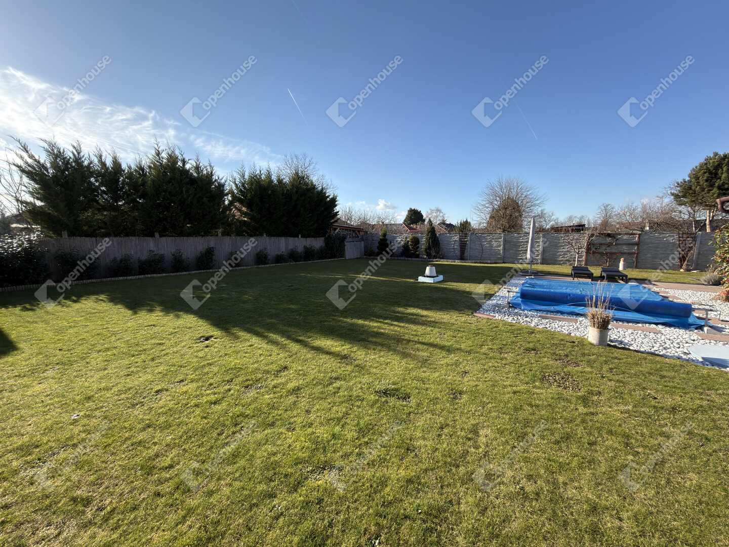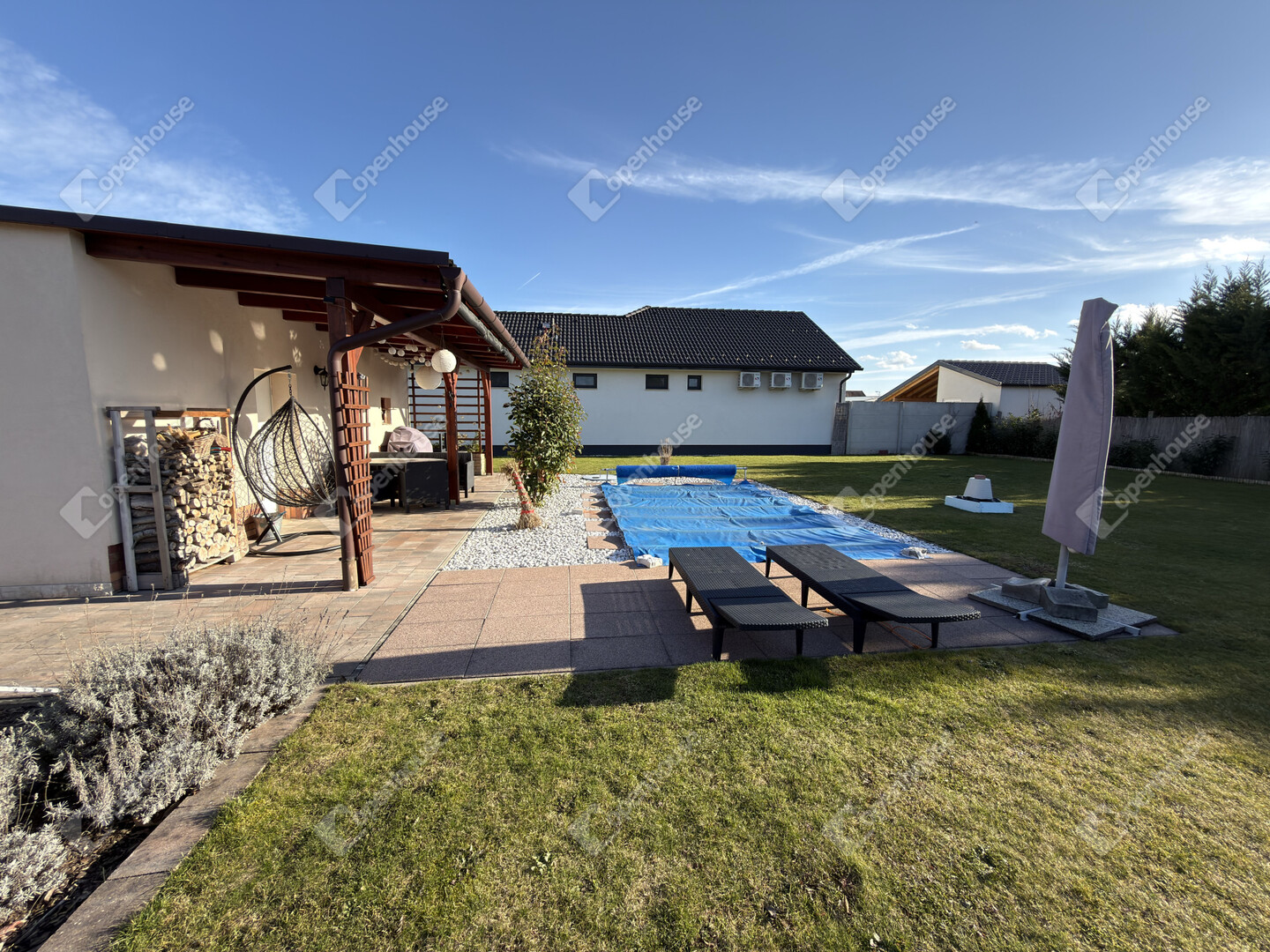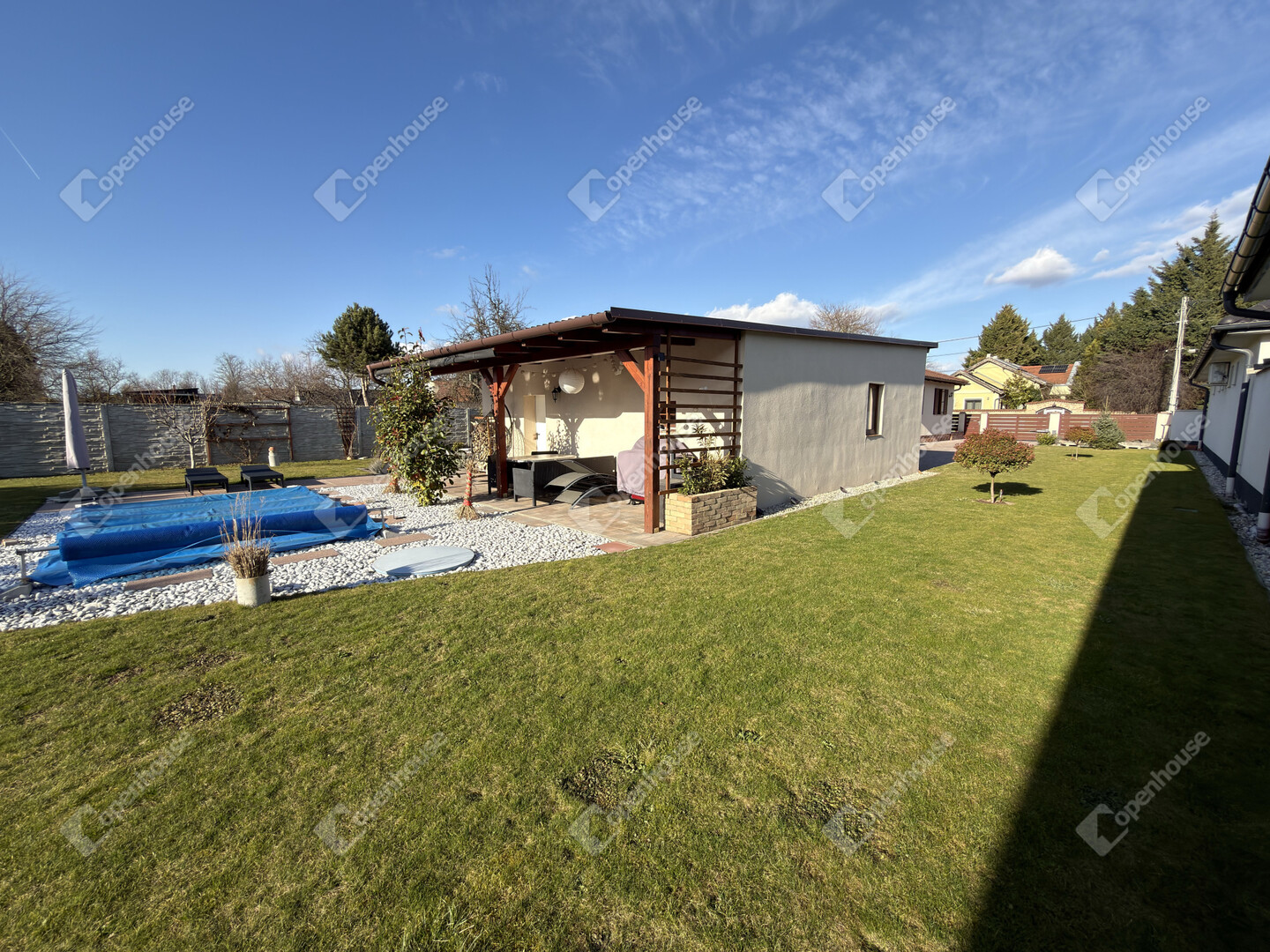 A nyári időszak kényelméről süllyesztett medence gondoskodik, a kert pedig valódi privát életteret biztosít tulajdonosának. A kert folyamatos fríssességéről Hunter automata öntözőrendszer gondoskodik. Az utcafronti alumínium kerítés pedig Hörmann automatikával van ellátva.