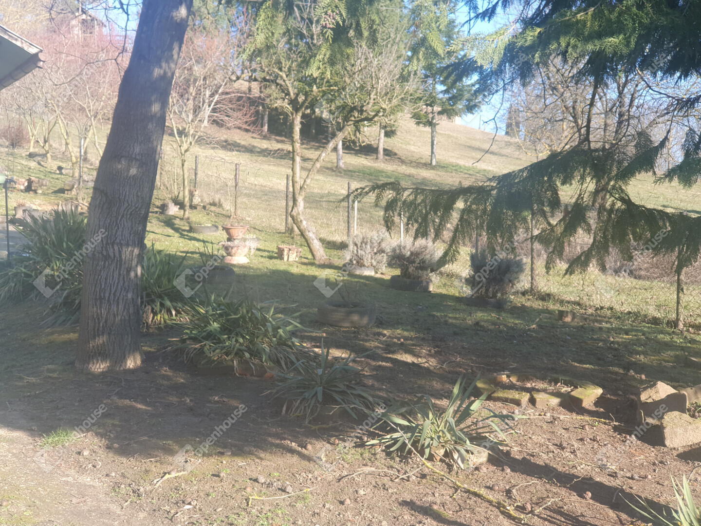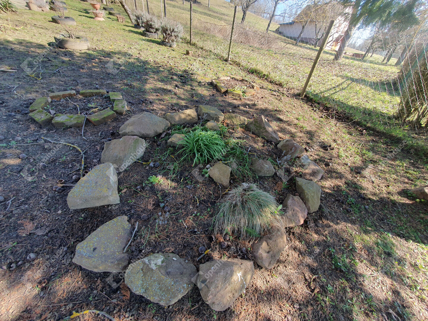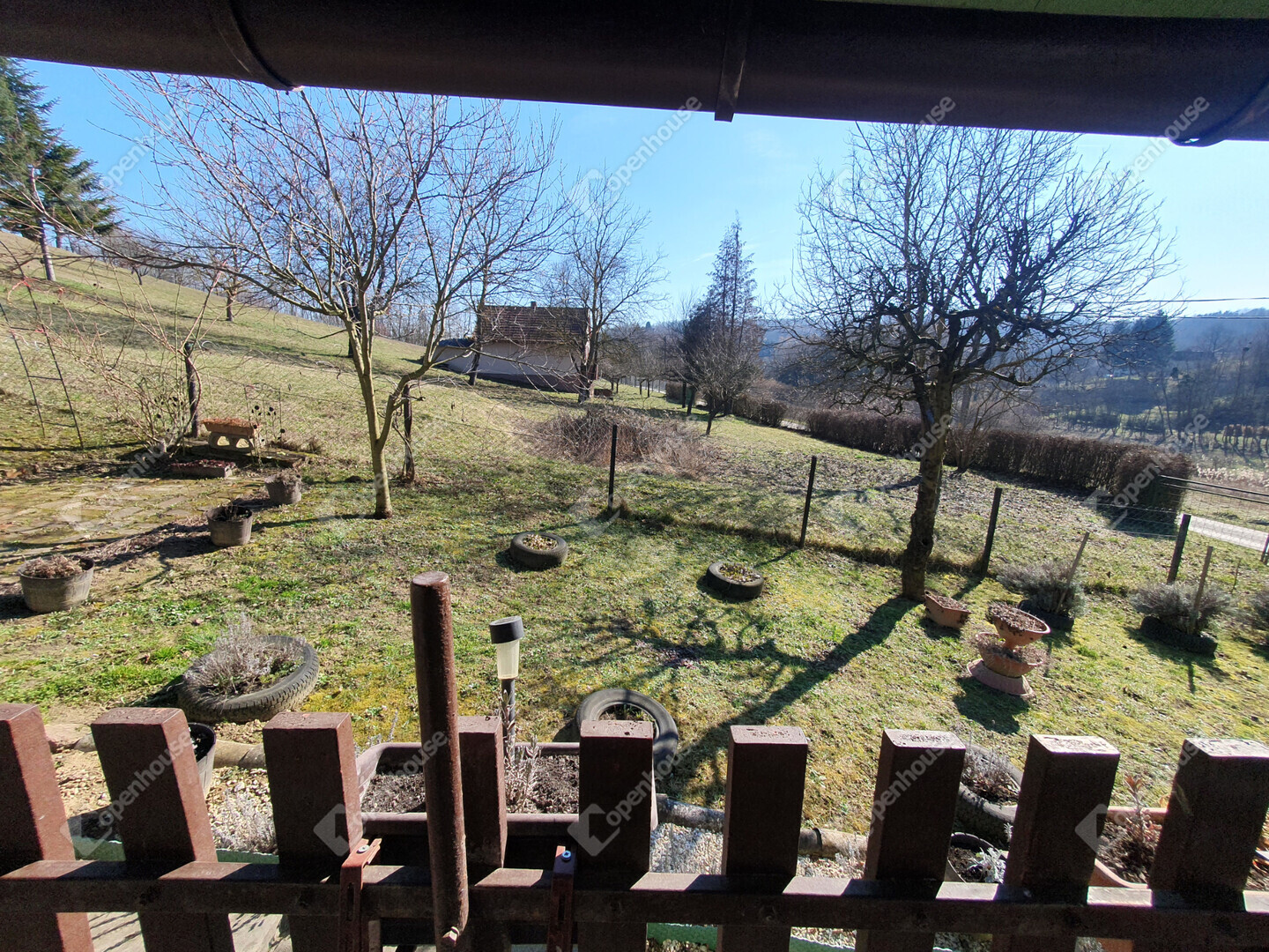 A telek enyhén, kényelmesen emelkedő, a kert végében teraszos kialakítású, felső útra nyíló résszel. A gondosan ápolt kertben számos évelő dísznövény és termő gyümölcsfa található.