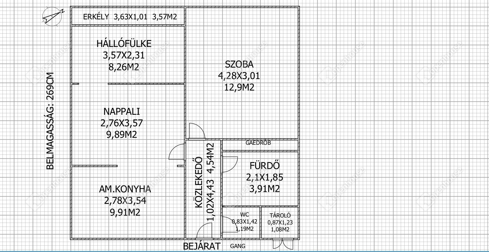 A lakás egyik legnagyobb előnye, hogy a nappaliból leválasztott hálórésszel plusz, jól használható szoba került kialakításra, így a tér élhetőbbé és sokoldalúbbá vált. Az elrendezés a következő: