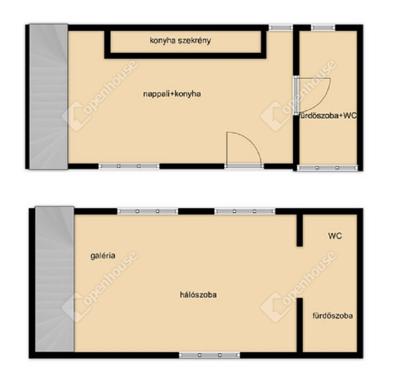 - A házban a nappali, konyha egy légtérben helyezkedik el, fürdőszoba WC egy helységben található.