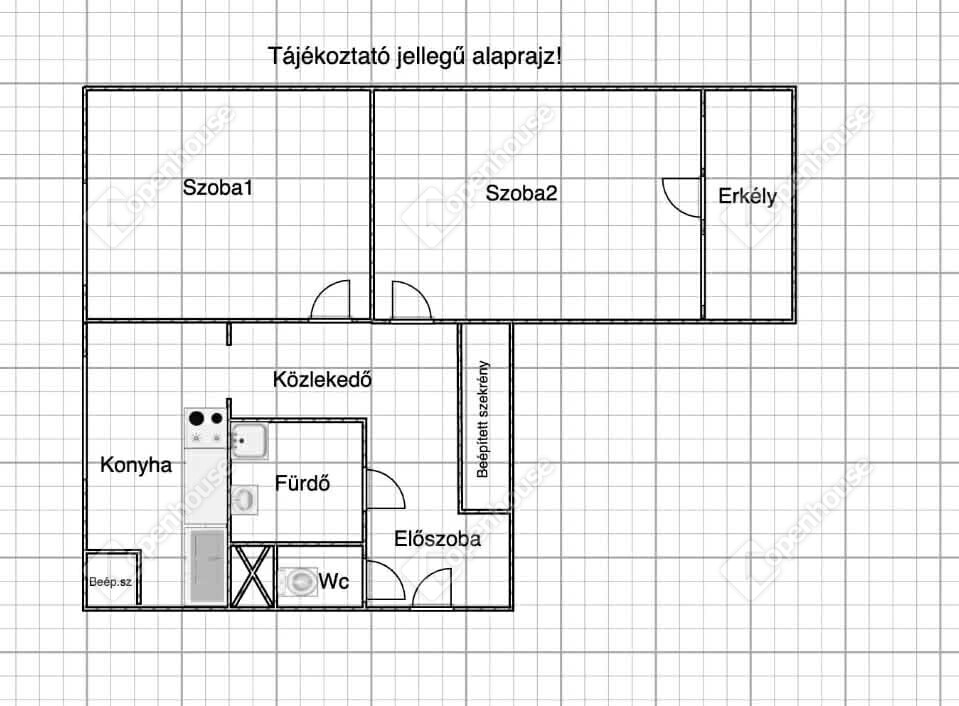 A 62 m²-es lakás praktikus belső kialakítással rendelkezik: két külön nyíló szoba, konyha, fürdőszoba, külön WC, előszoba és közlekedő helyiségek alkotják. Az ingatlanhoz erkély is tartozik, amely kellemes kiegészítője a lakásnak, és lehetőséget biztosít egy kis pihenősarok kialakítására.