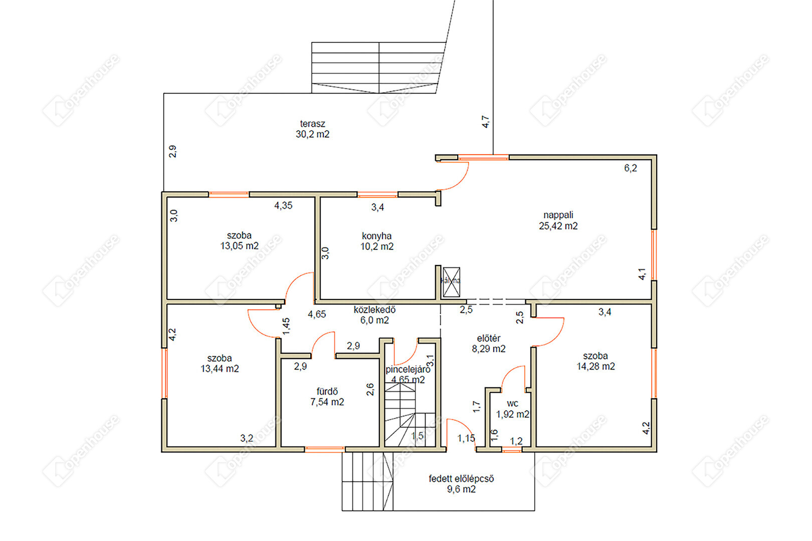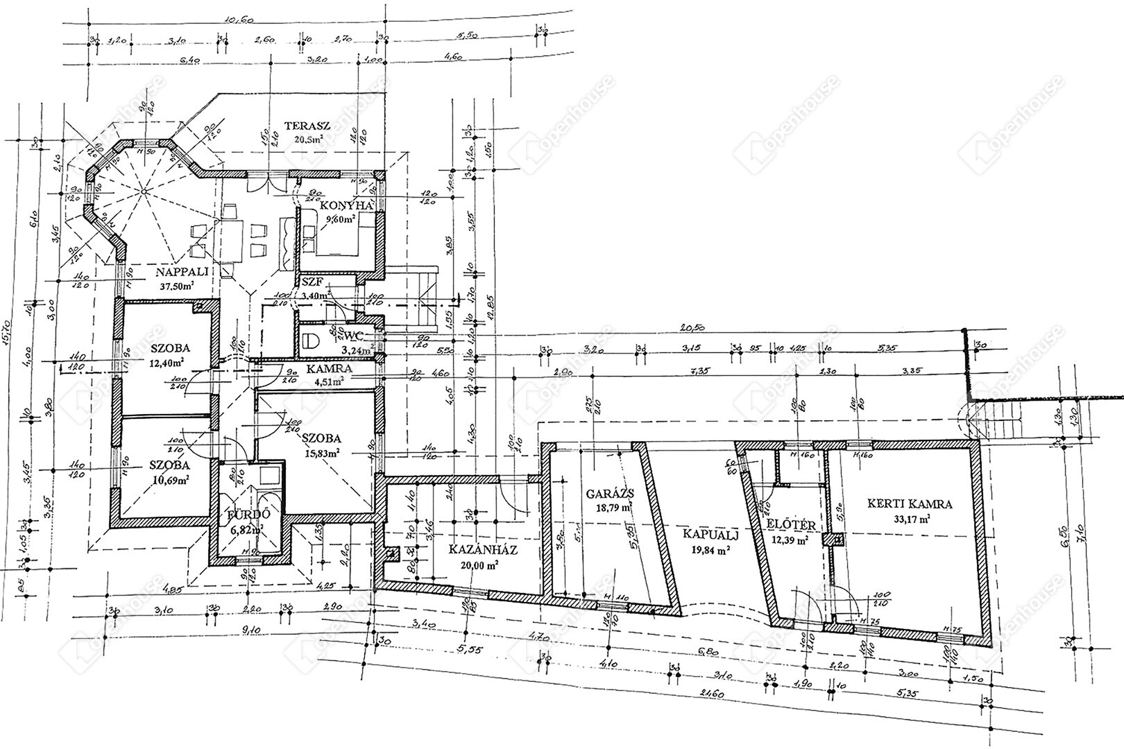 - magasföldszint: 3 hálószoba, nappali-étkező, konyha, közlekedő, fürdő, WC, előtér, terasz