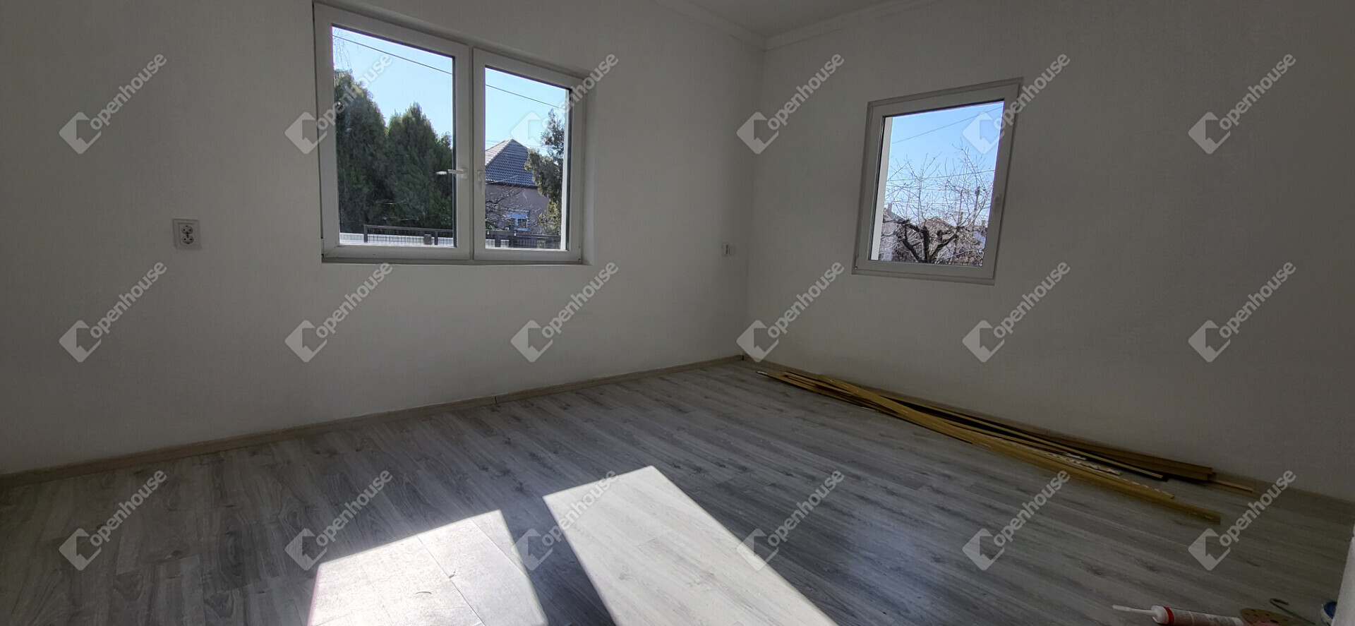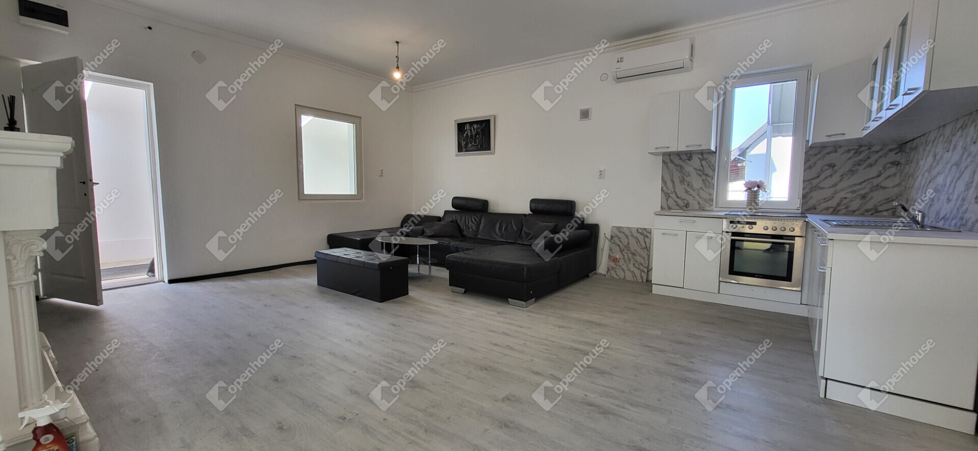 az amerikai konyhás nappali és a legnagyobb hálószoba laminált burkolatot kapott,