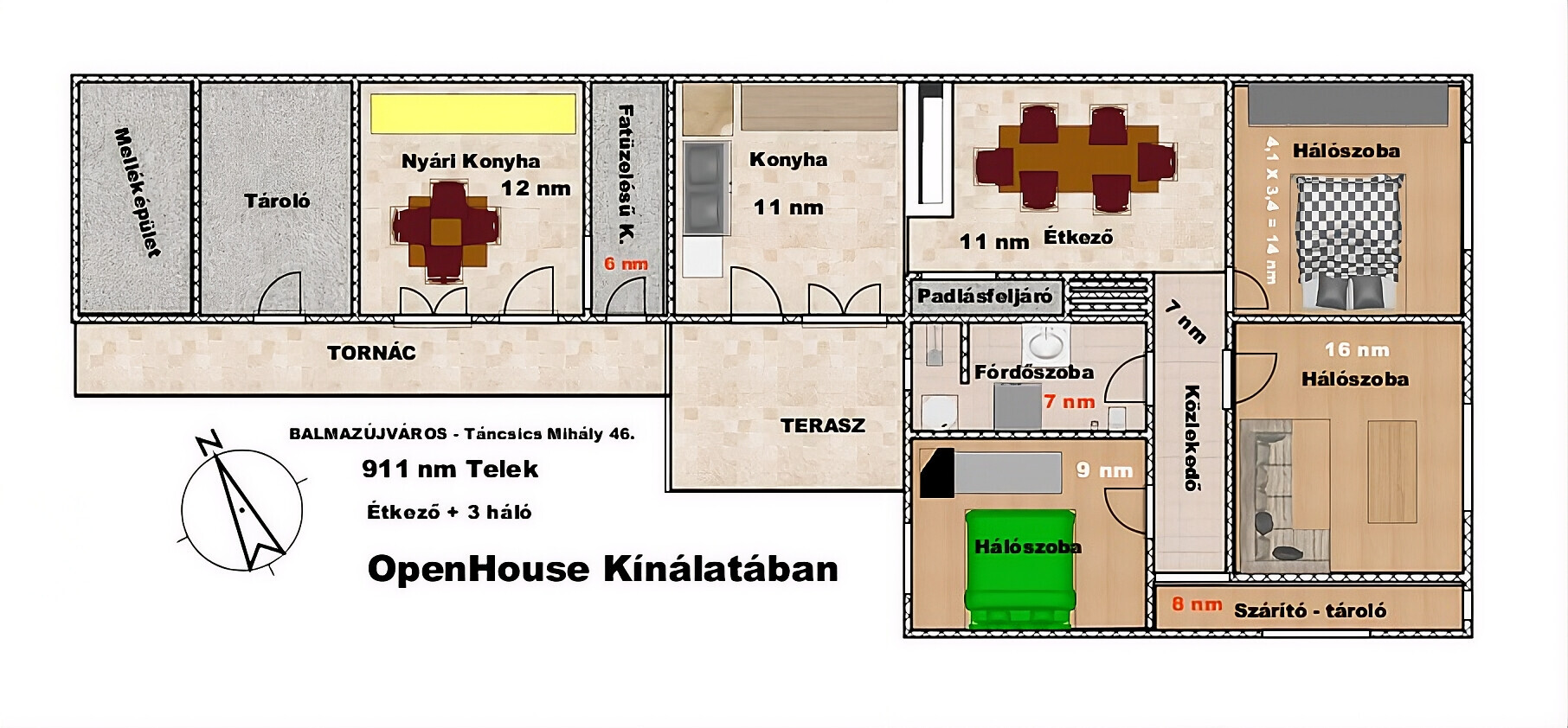 A házhoz tartozó 911 nm-es telek számos lehetőséget kínál: kialakítható rajta konyhakert és/vagy pihenőkert, játszótér vagy akár kisebb gazdálkodásra alkalmas terület is.
