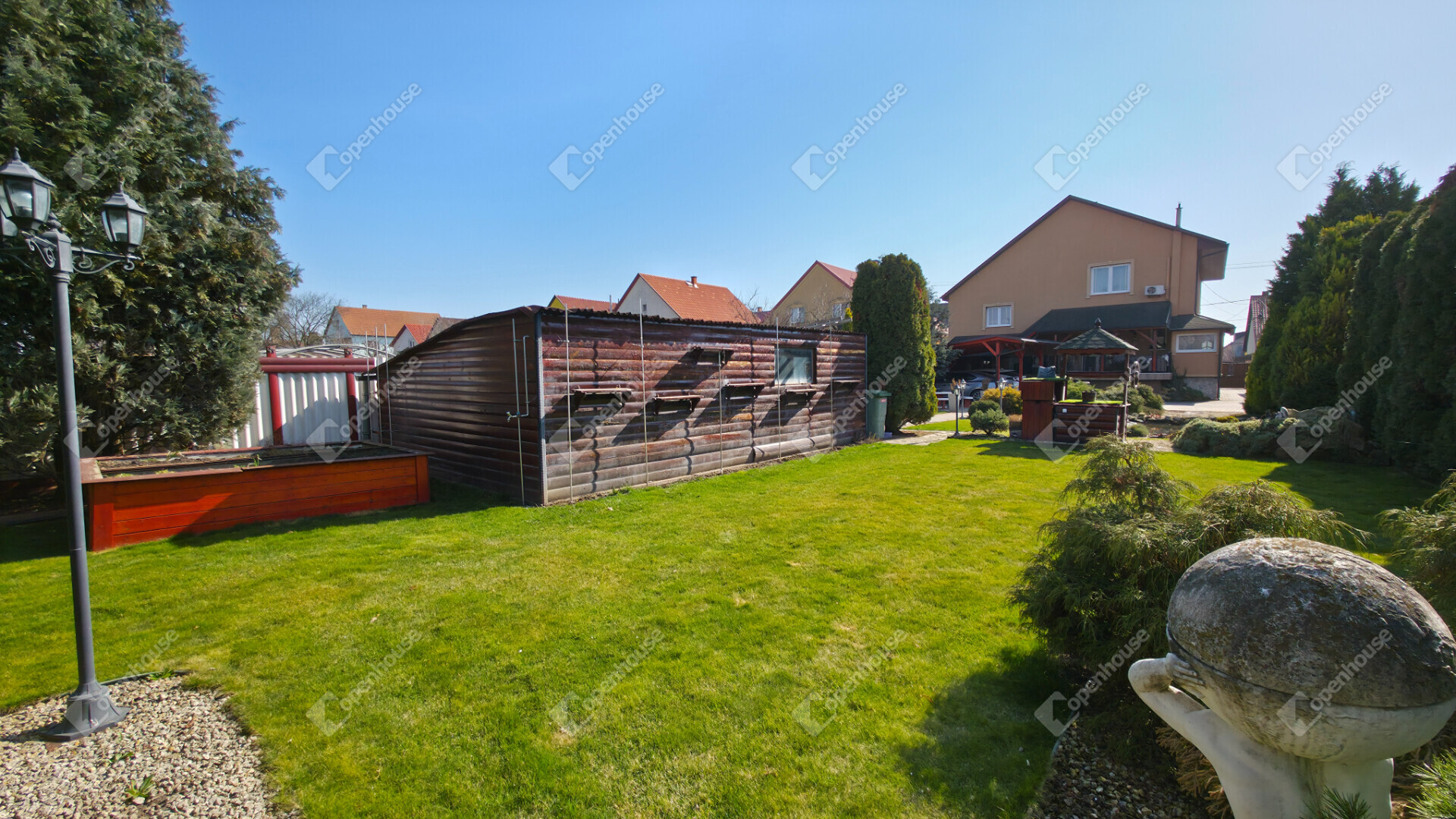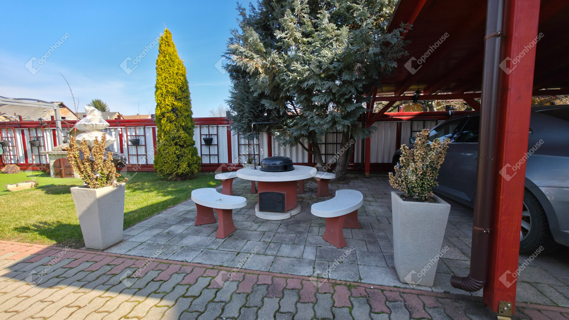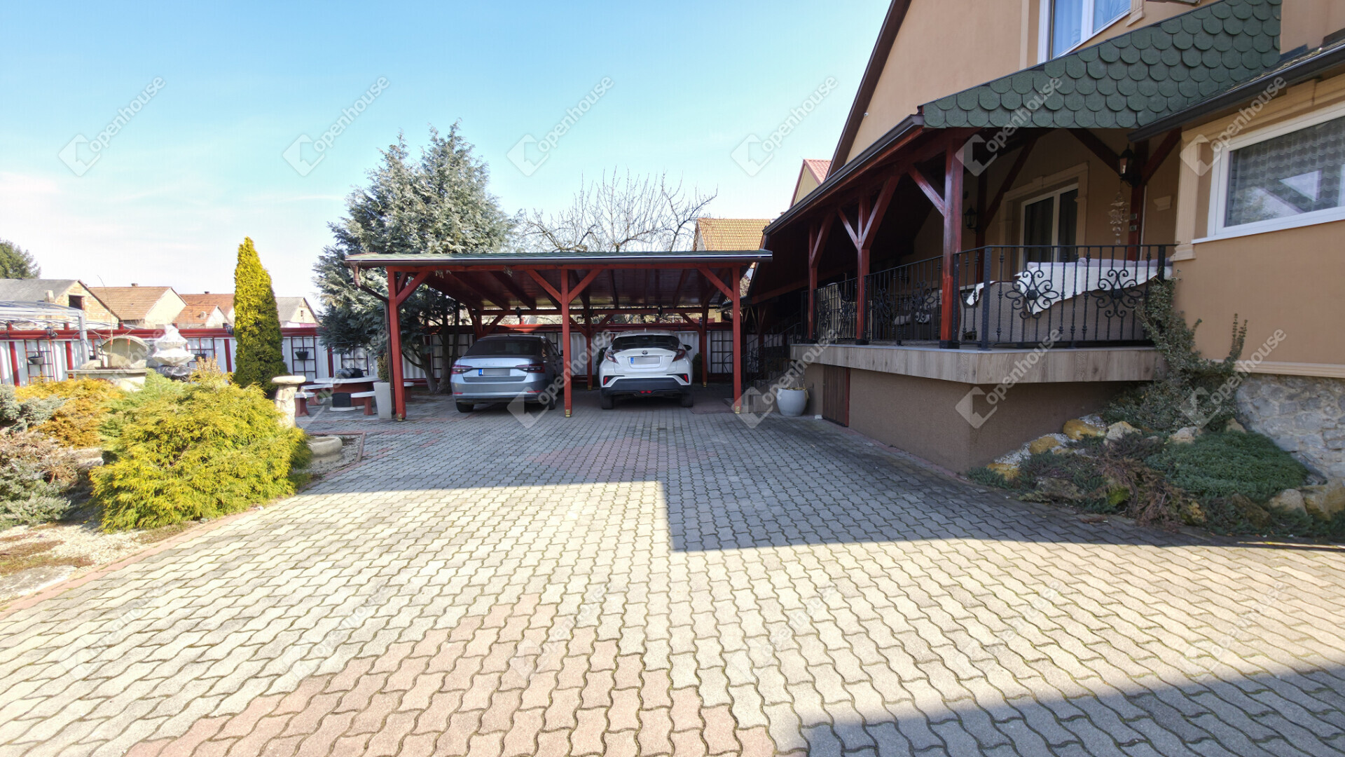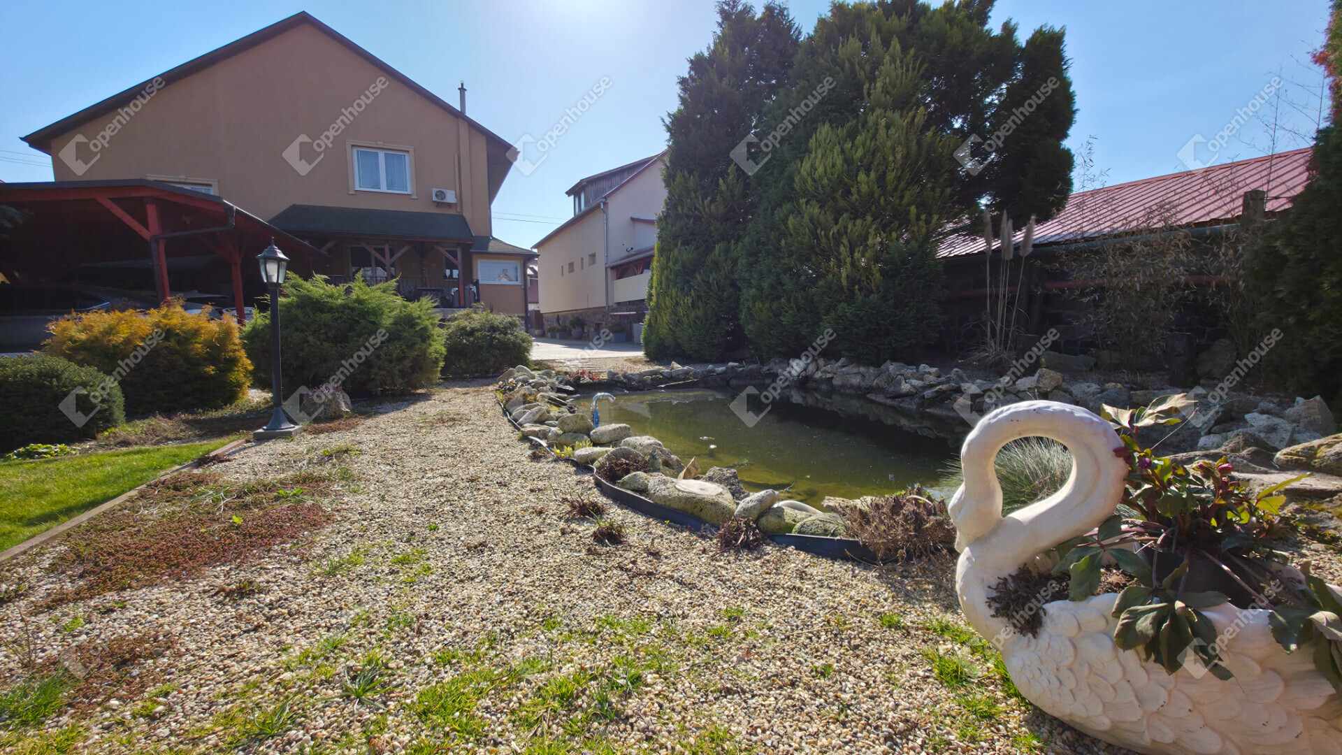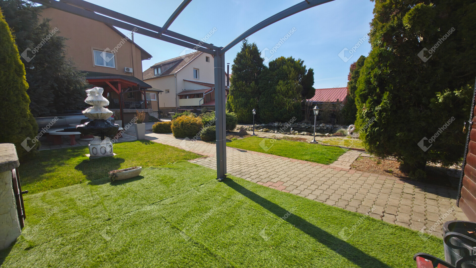 - térkövezett és parkosított kerttel rendelkezik, 2 állásos fedett kocsibeállóval, öntözőrendszerrel, szalonnasütővel, grillsarokkal, fúrt kúttal és egy igazán különleges kerti tóval