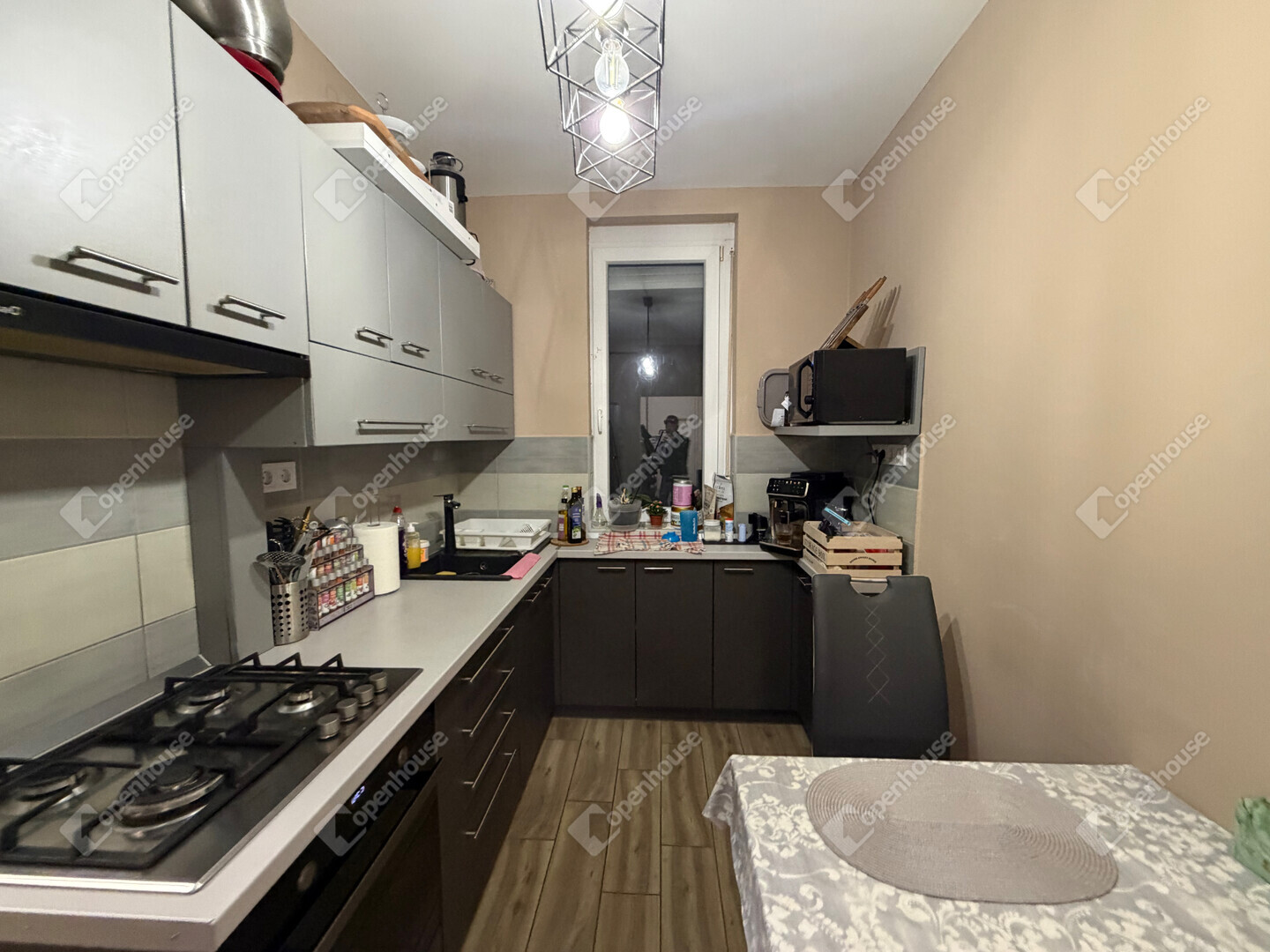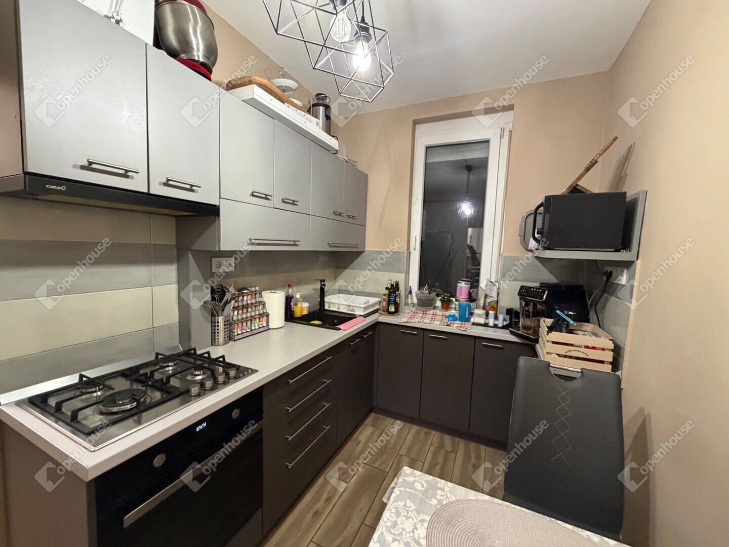 modern burkolatok, korszerű beltéri ajtók, valamint egy 3–4 éves, modern konyhabútor, amelyhez szinte új állapotú gépek tartoznak.
