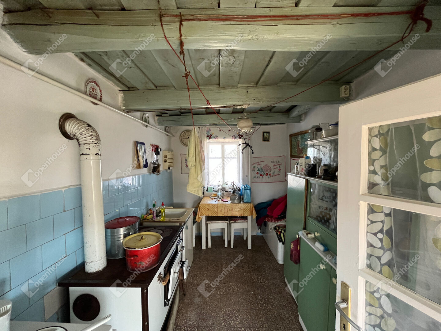 a teraszról nyílik a hátulsó, gerendás kis konyha