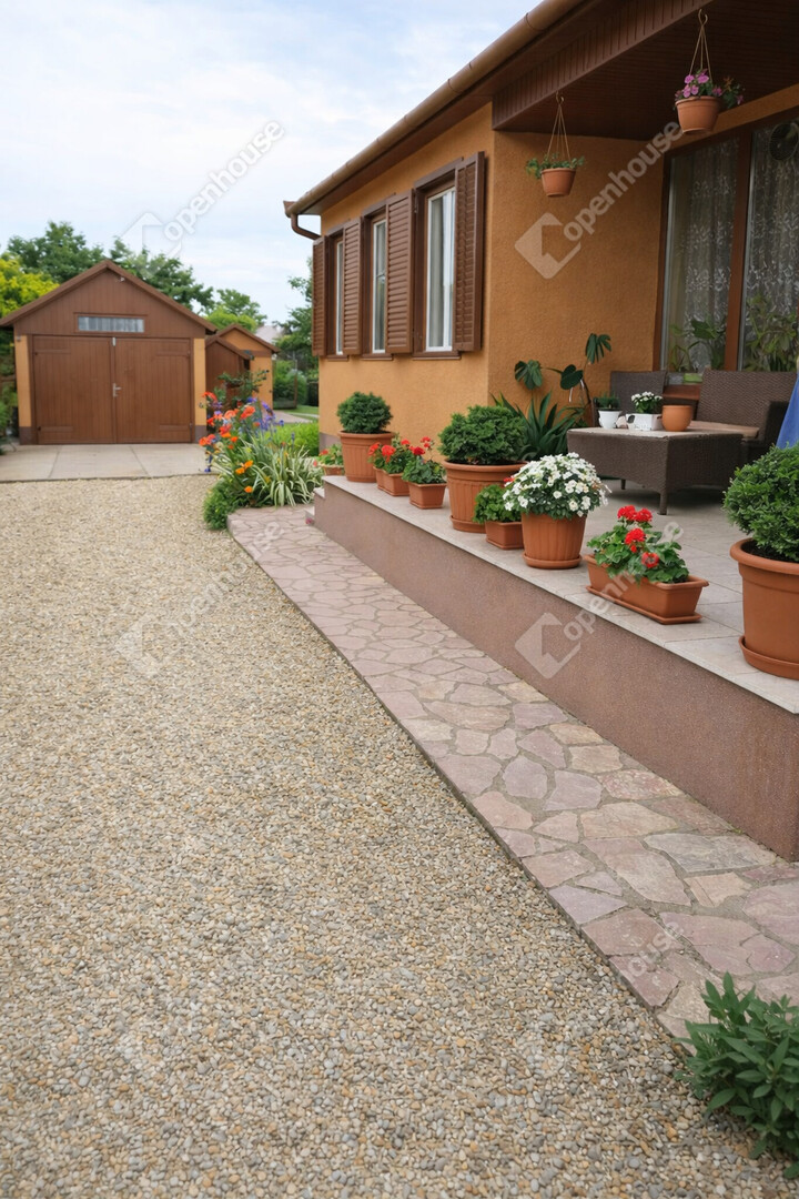 Az udvar rendezett és tágas, ahol garázs és külön tároló is rendelkezésre áll.