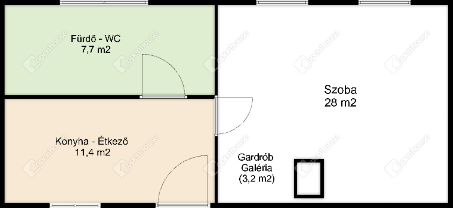 - 1 szoba + gardrób (galériás) + konyha + fürdő / WC