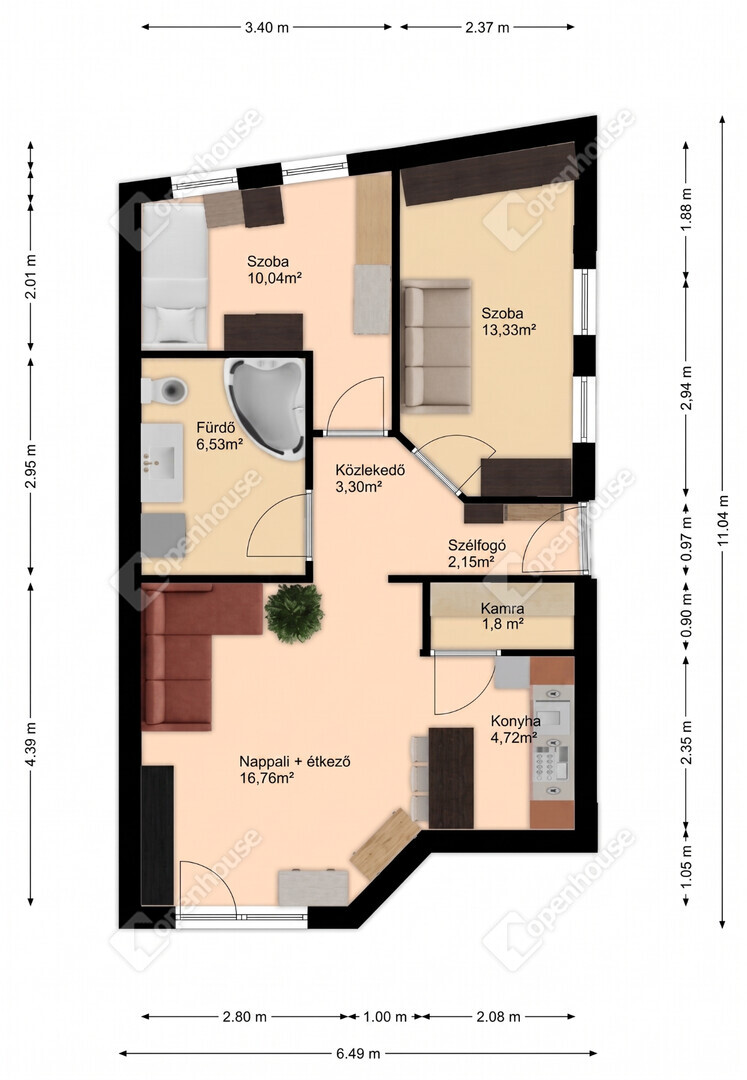 | Szoba | 13.33 m2 | Laminált padló |