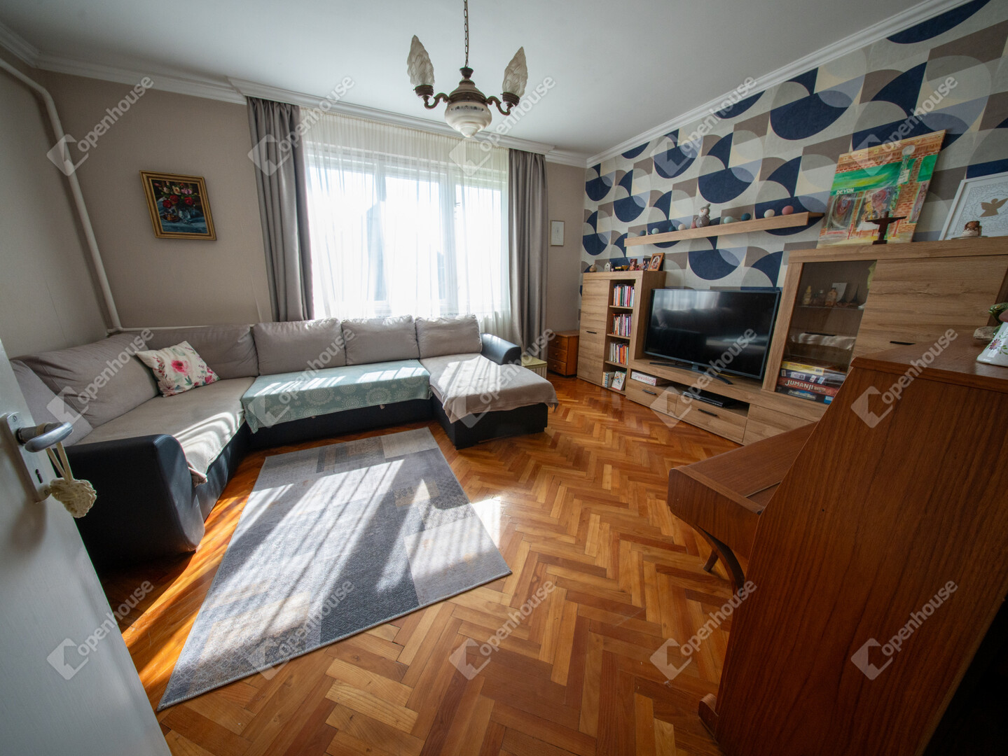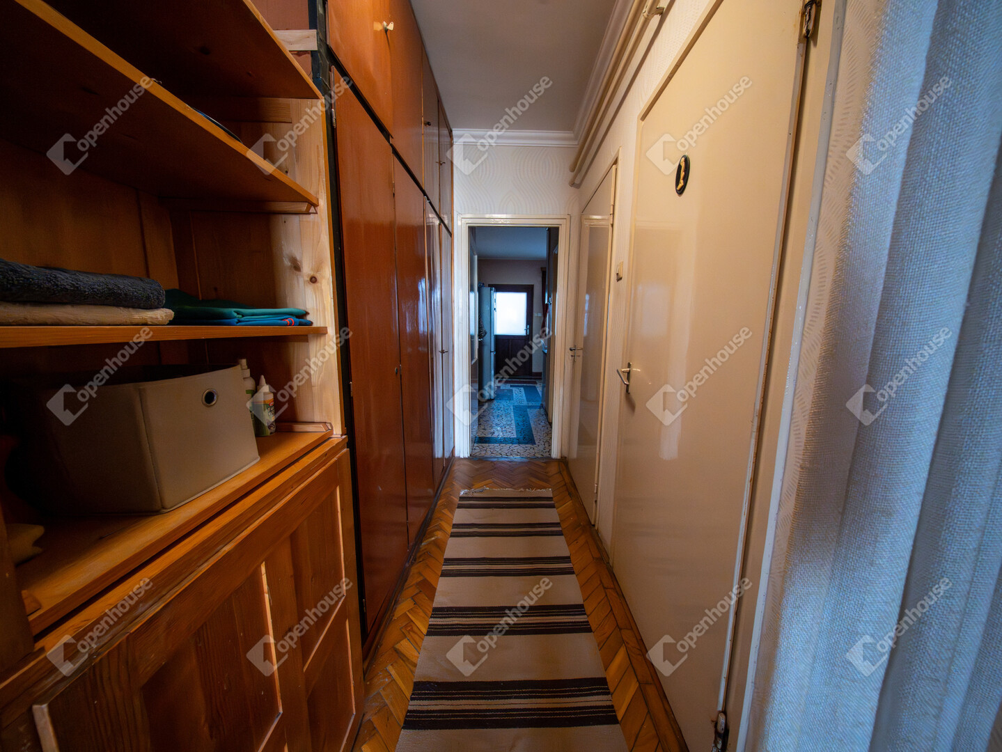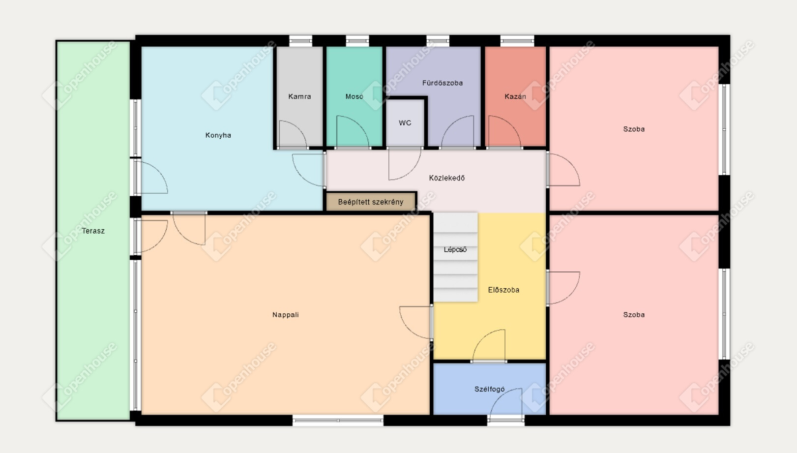 A földszinten előszoba, három különálló szoba, konyha, spájz, kádas fürdőszoba, külön WC és kazánház található.