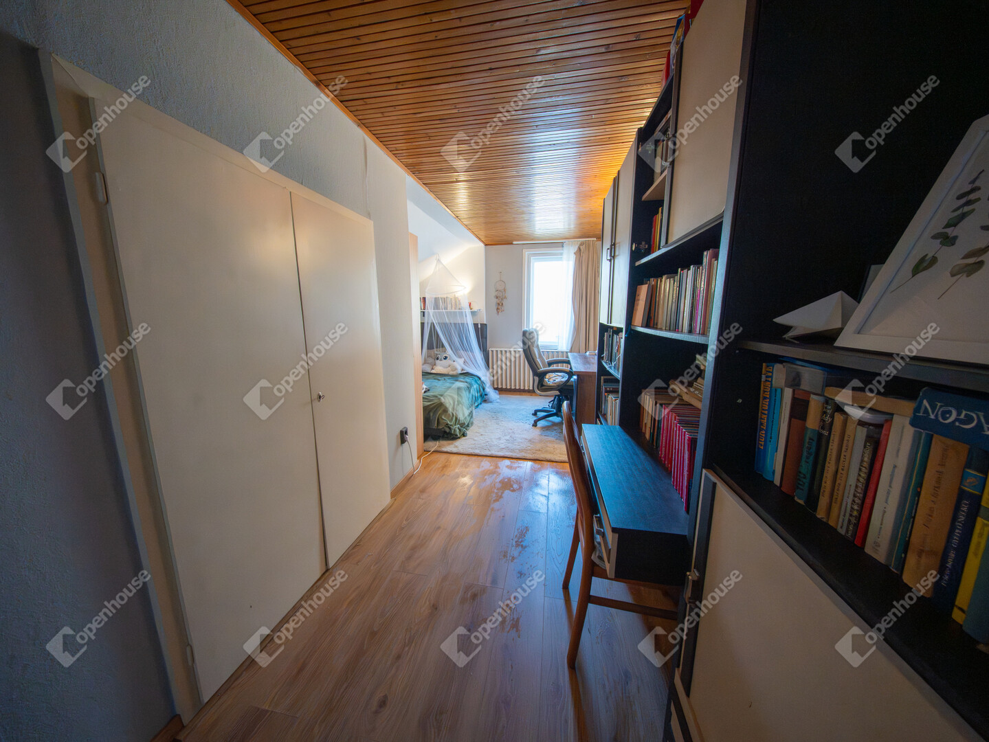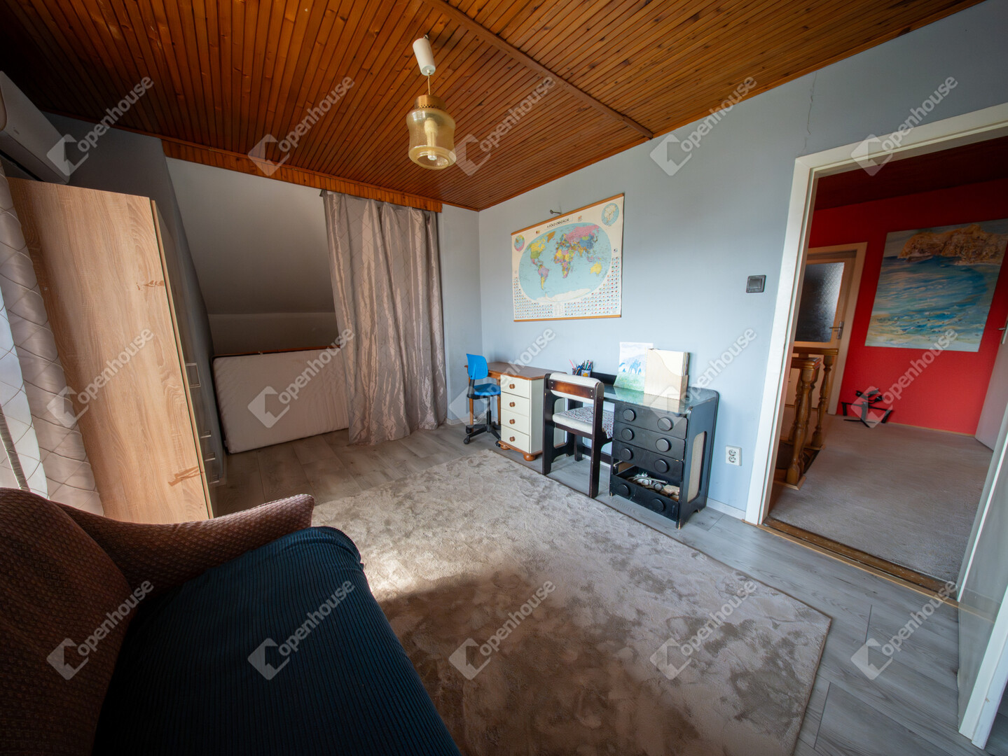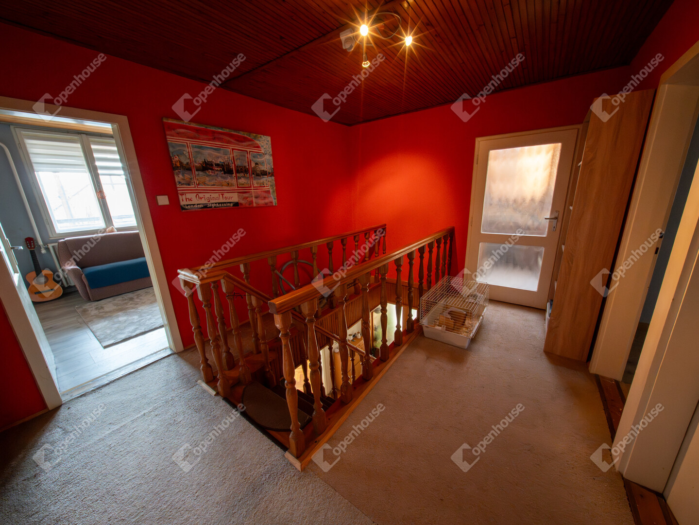 Az emeleten egy előtér, három gardróbos szoba, egy félszoba, kádas fürdőszoba, külön WC kézmosóval és egy erkély kapott helyet.