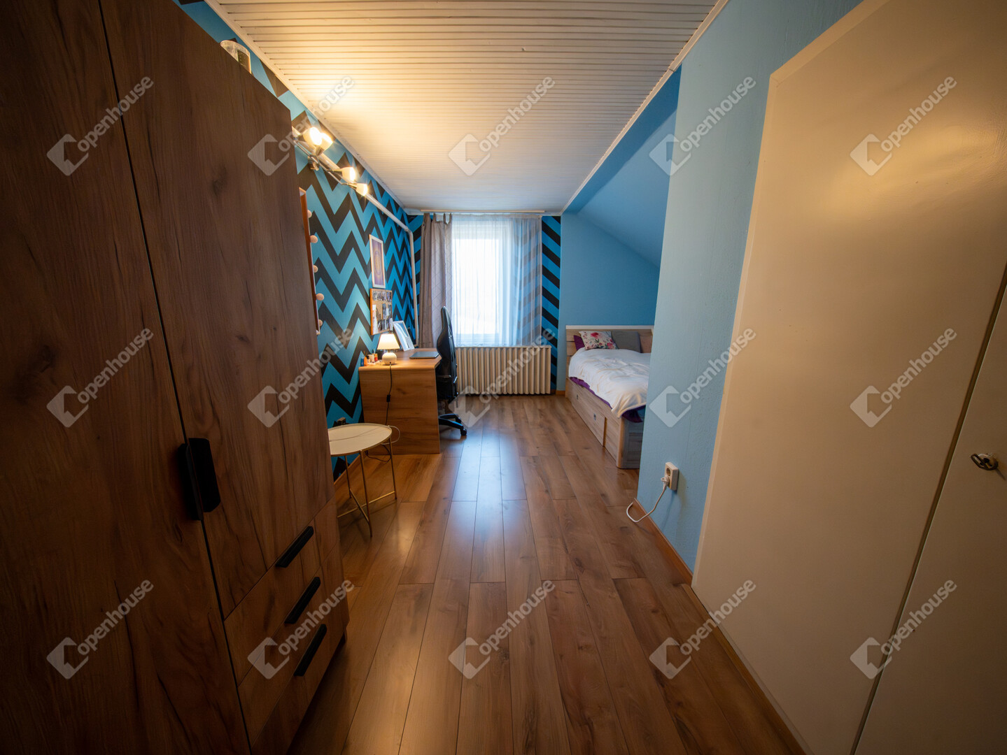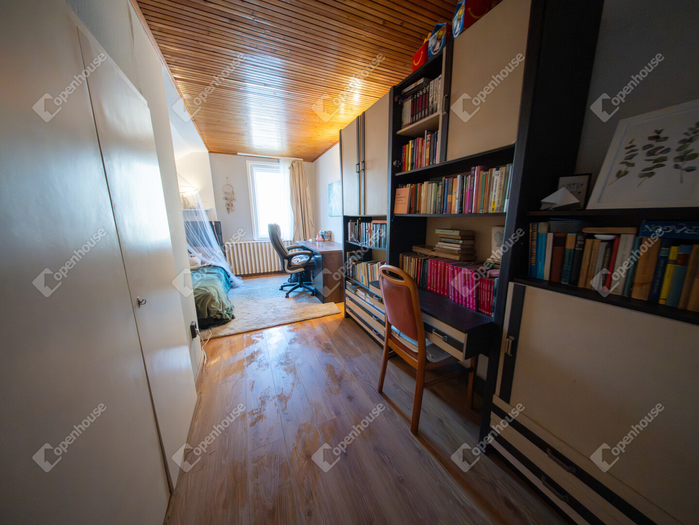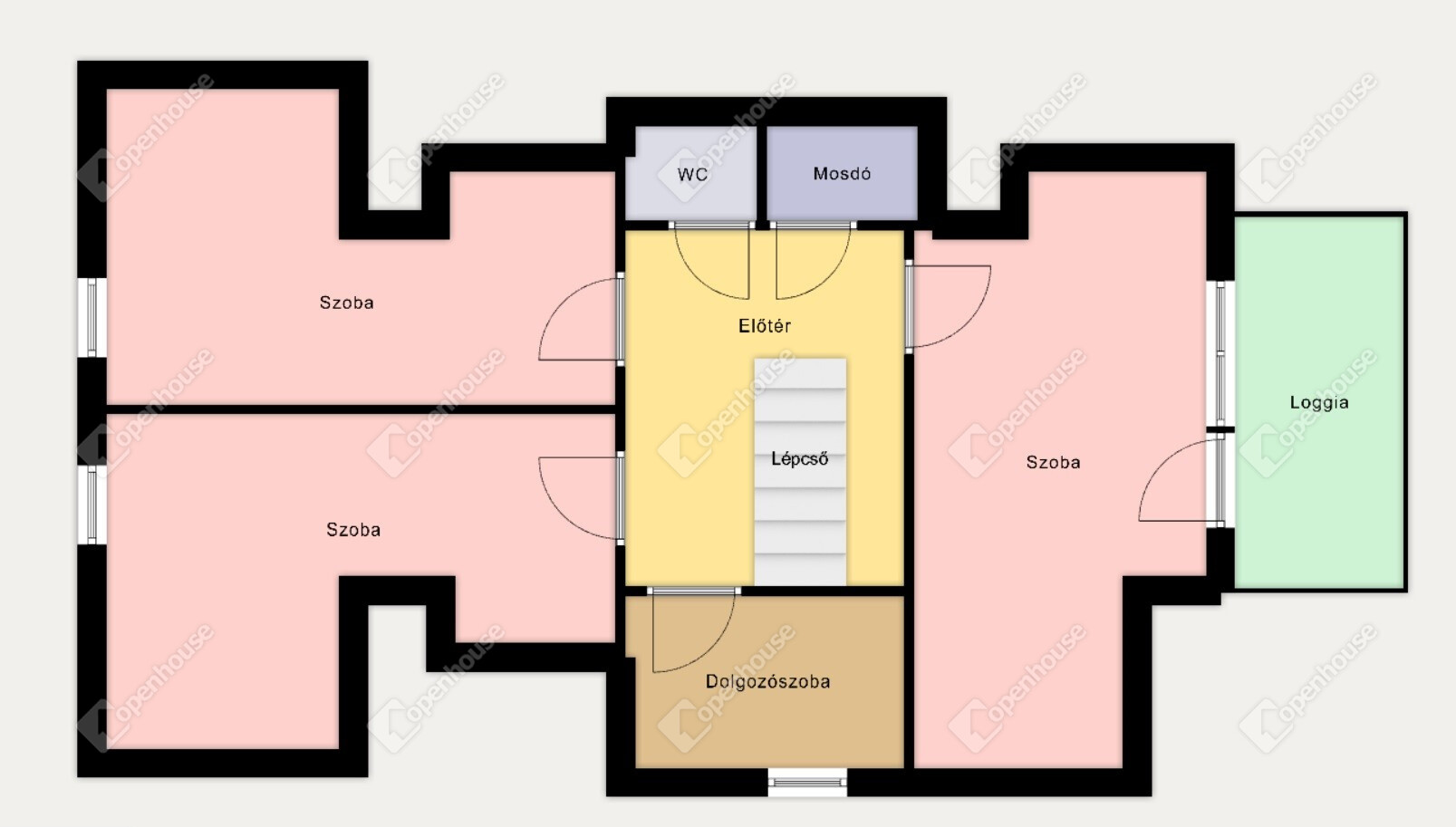 Az emeleten egy előtér, három gardróbos szoba, egy félszoba, kádas fürdőszoba, külön WC kézmosóval és egy erkély kapott helyet.
