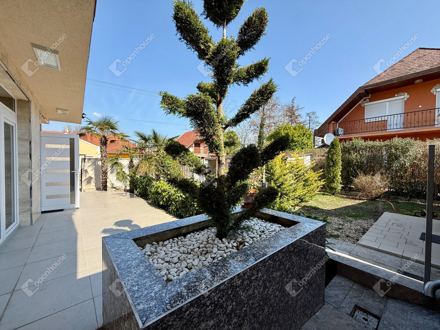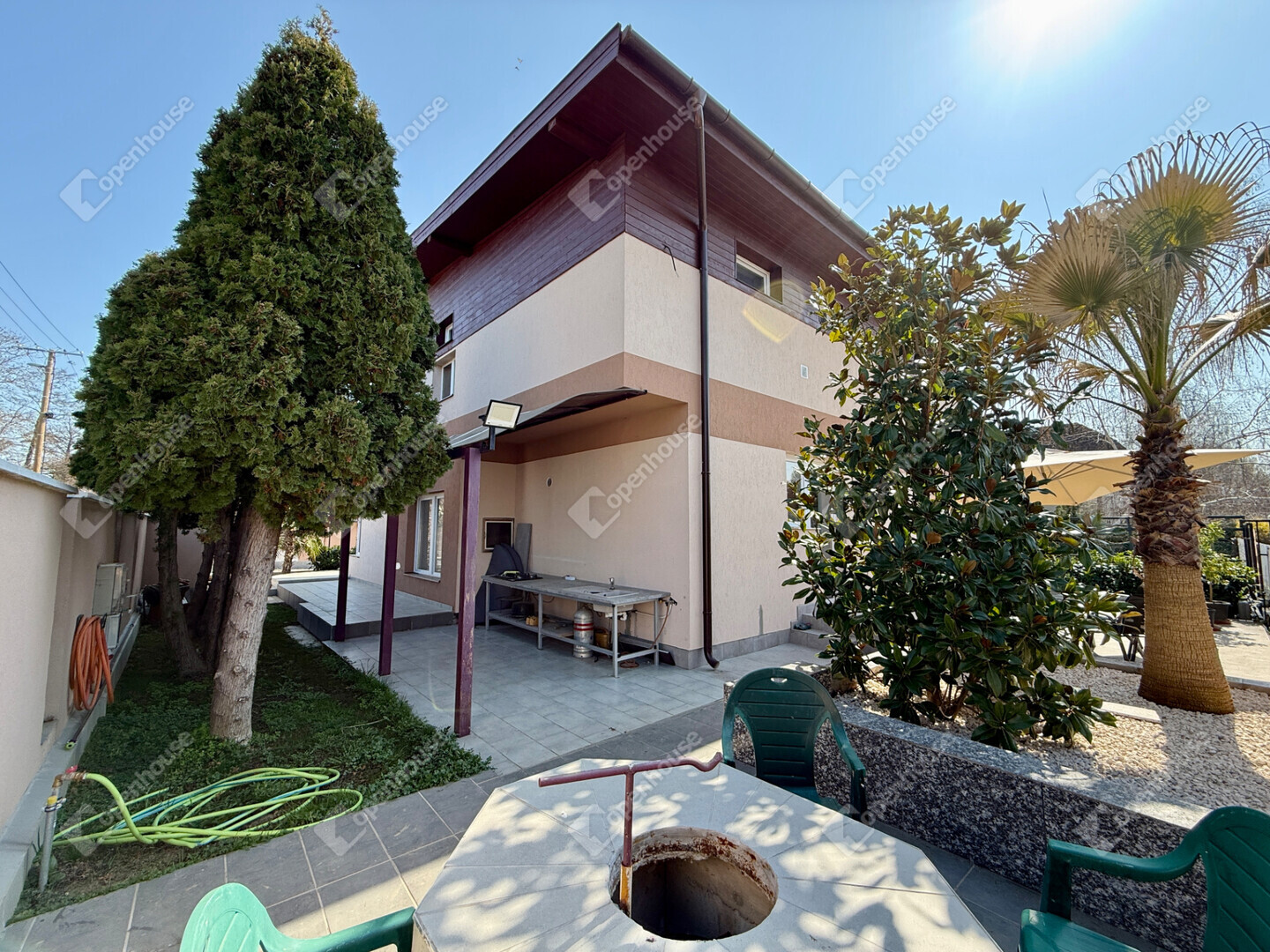 Az öntözőrendszer a teljes kert gondozását automatikusan biztosítja, fúrt kútról működtetve, így a fenntartási költségek is kedvezőek.