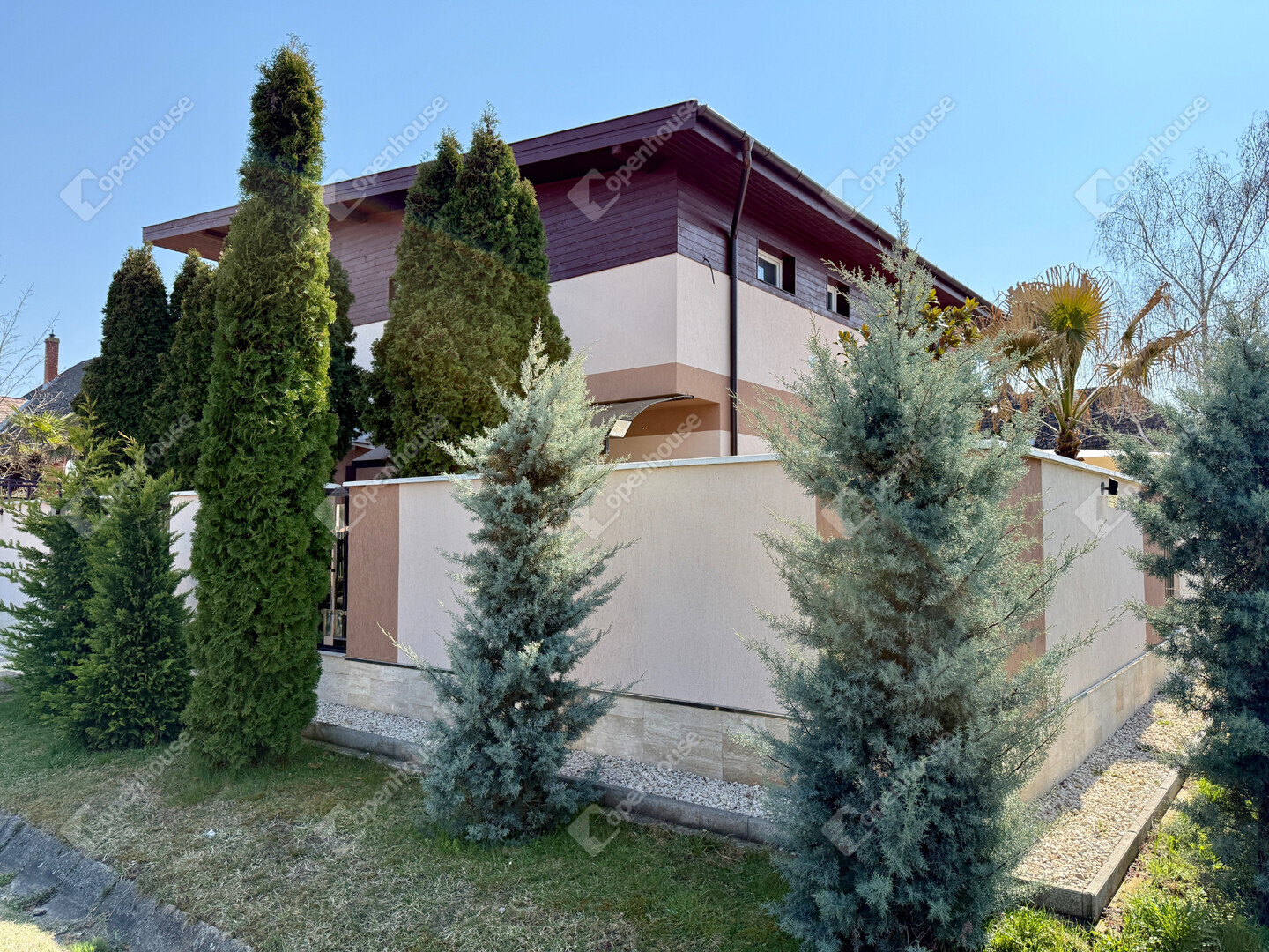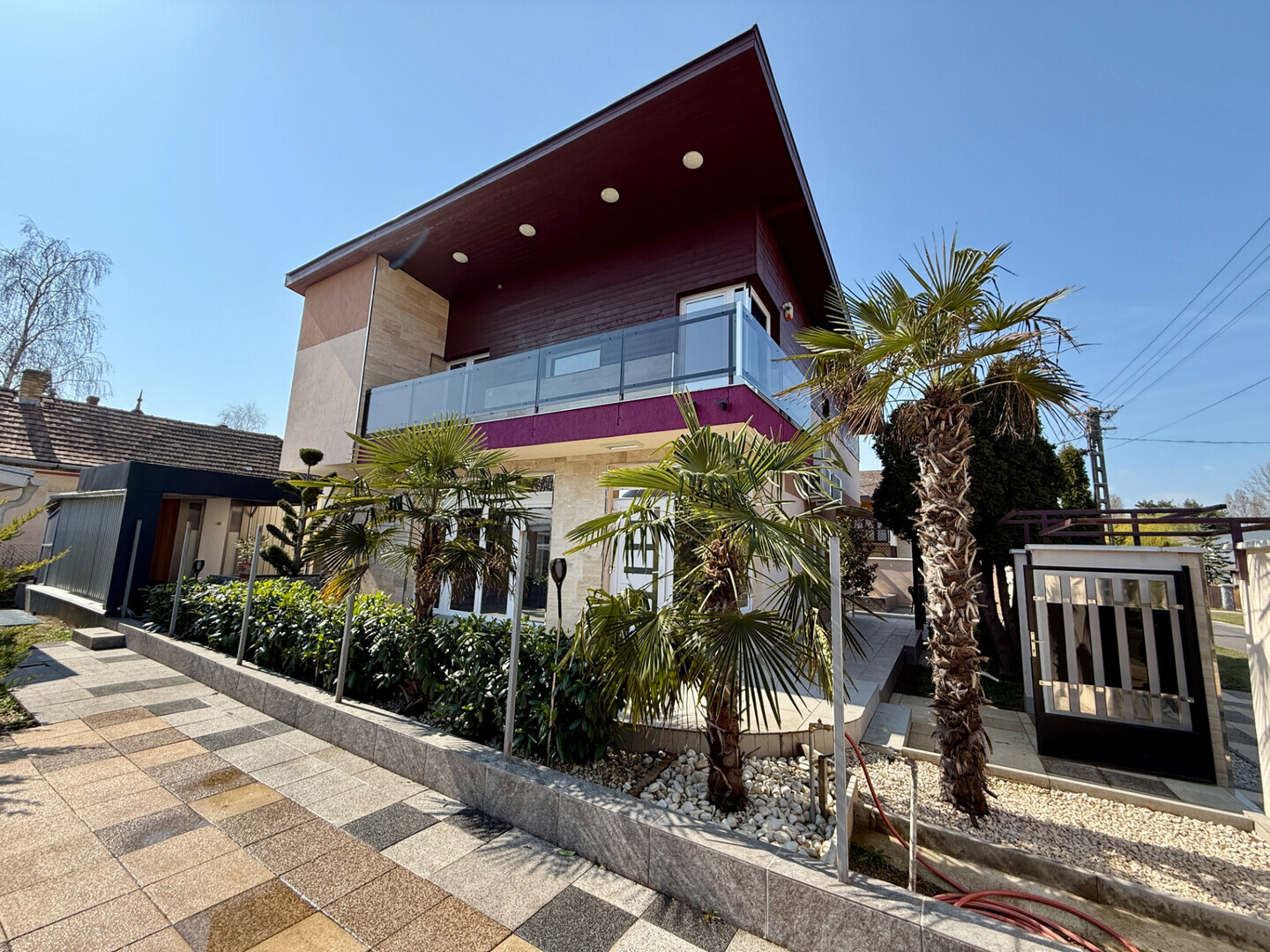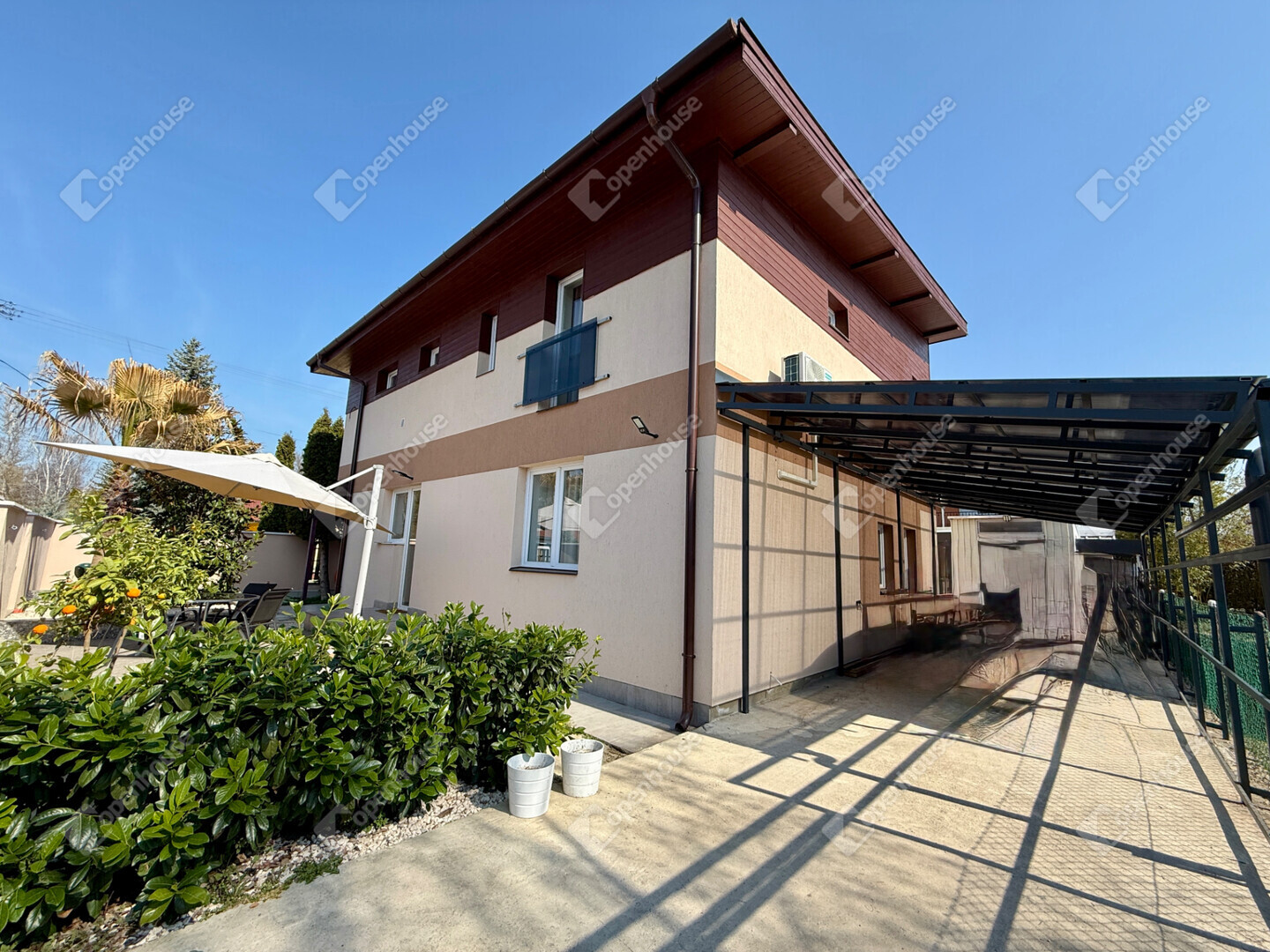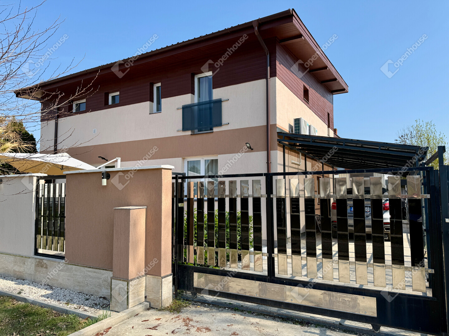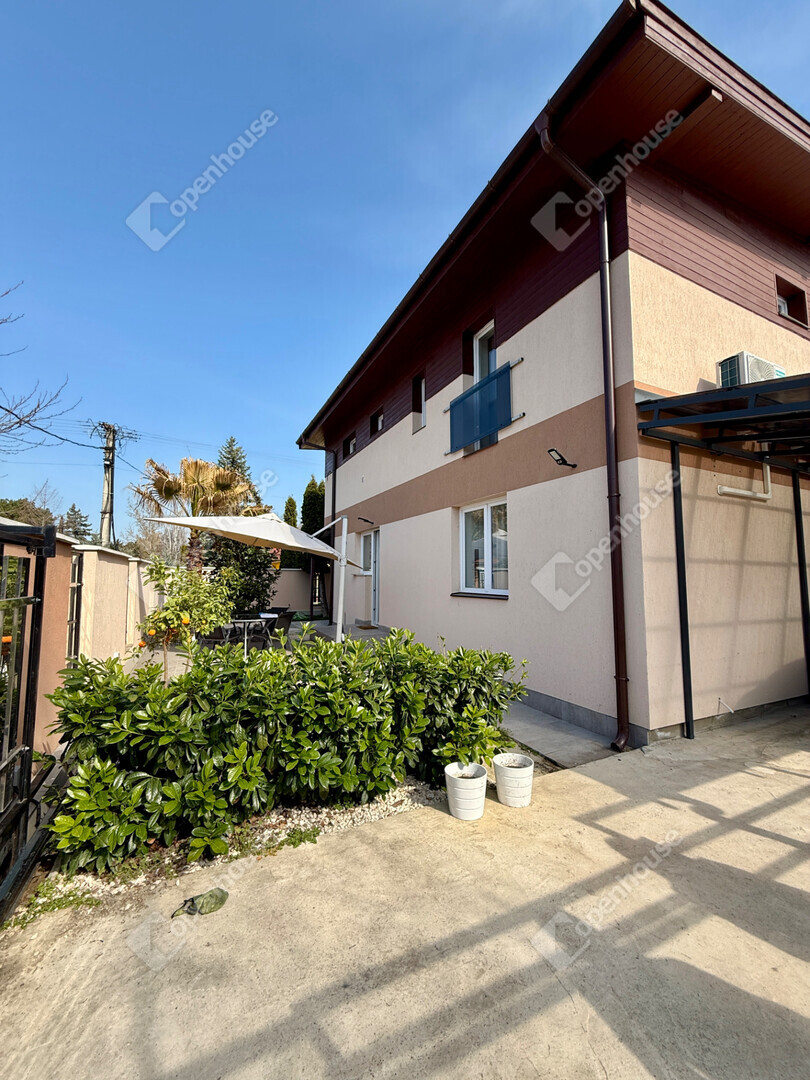 A mediterrán hangulatot árasztó ingatlan nemcsak esztétikájával, hanem praktikus kialakításával is kiemelkedik. A saroktelek adottságainak köszönhetően két irányból megközelíthető, így több autó számára is kényelmes parkolási lehetőséget biztosít – fedett és nyitott, zárt udvari beállókkal egyaránt.